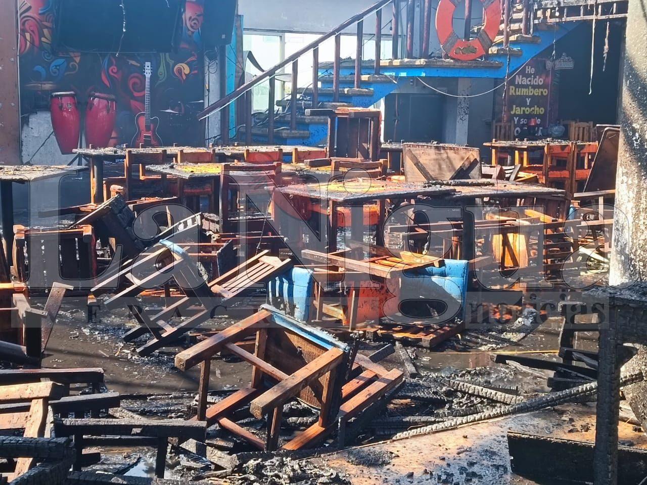 Presuntamente lanzaron artefactos explosivos hacia la palapa de palma, por lo que de inmediato se generó el incendio, consumiendo todo a su paso. Antes de escapar, los responsables dejaron una lona con mensajes de amenazas en la entrada principal del lugar.