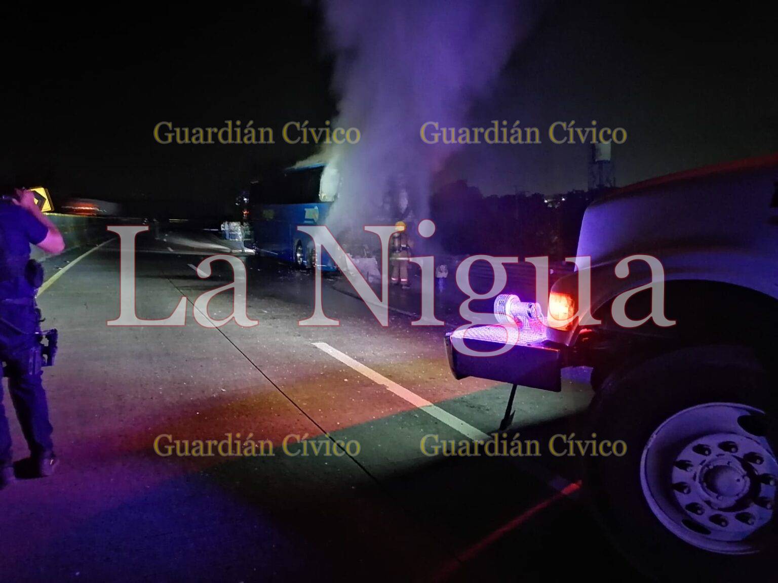 Amatlán, Ver.- Una movilización por parte del personal de bomberos de Córdoba, Amatlán personal de (Capufe) y autoridades de la Policía Estatal así como Guardia Nacional, fue lo que dejó la madrugada de este martes el incendio de un autobús turístico el cual se incendió al momento de circular sobre kilómetro 296+800 de la autopista Veracruz-México a la altura del trébol de Amatlán.