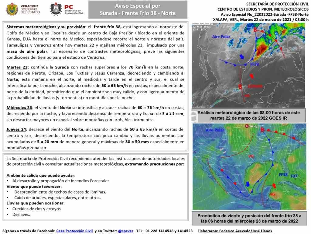 Resumen: Durante este martes se prevé ambiente caluroso y seco en buena parte de la entidad, debido al evento de Surada que se registra en algunos sectores del estado, el cual disminuirá hacia el mediodía en la zona centro y por la noche en los sectores de la zona sur. Después del máximo calentamiento se pueden presentar algunos chubascos con tormentas aisladas especialmente hacia los límites con el estado de Puebla. En la costa norte el viento cambiará al Norte con posibles rachas de 45 a 60 km/h, efecto que se extenderá al resto del litoral por la tarde-noche e intensificándose desde las primeras horas de mañana cuando son probables rachas de 60 a 75 km/h. Se recomienda seguir con las precauciones, evitar acciones que puedan originar incendios forestales, de pastizales y de basureros, así como seguir las indicaciones de las autoridades locales de protección civil. Consulte actualización del Aviso Especial.