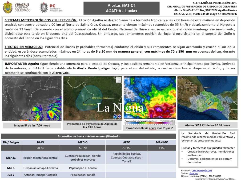 Pacífico Este: huracán Agatha se degrada a Depresión Tropical con centro a 90 km al Norte de Salina Cruz, Oaxaca, vientos máximos sostenidos de 55 km/h y desplazamiento al Noreste a 13 km/h.
