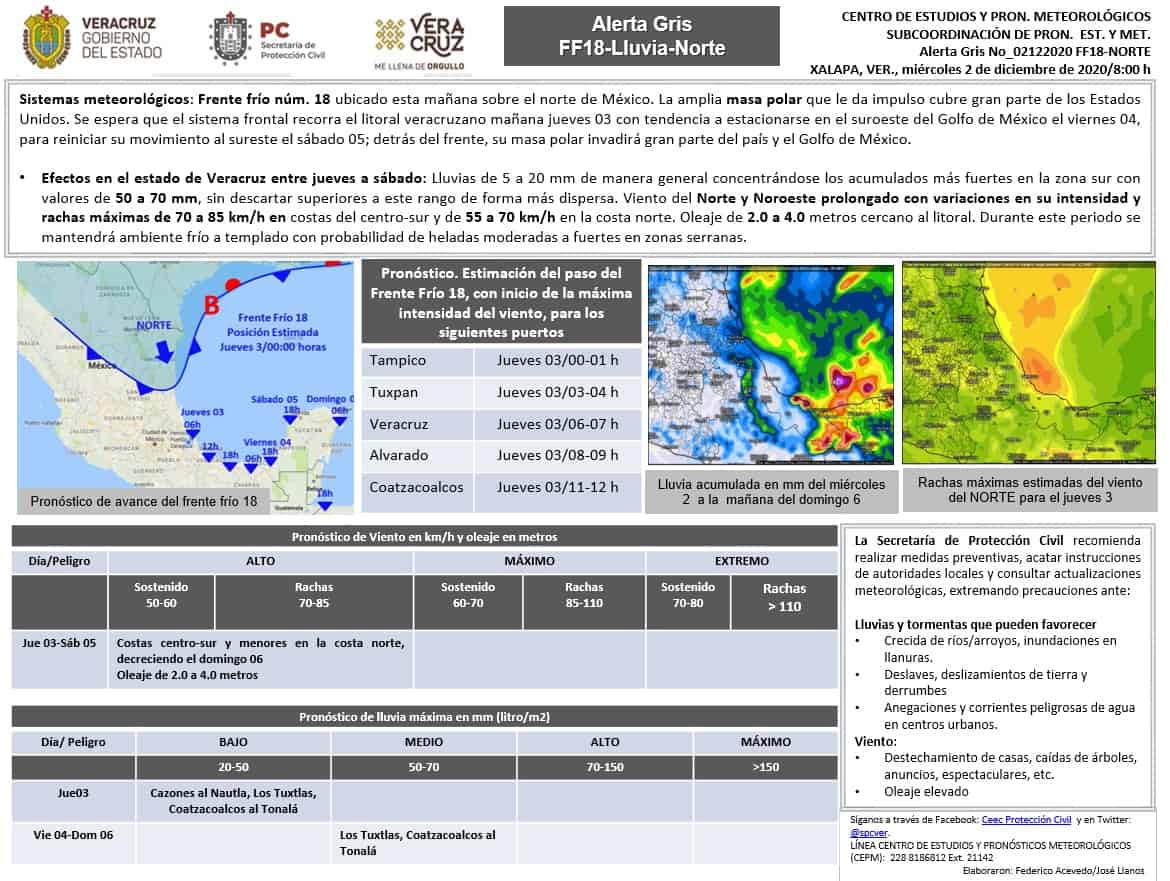 Resumen: En las próximas 24 horas se espera dominen condiciones para nieblas, lloviznas y lluvias aisladas especialmente en la zona norte y regiones montañosas. Los valores de la temperatura máxima aumentan ligeramente. Viento dominante del Este y Sureste de 20 a 35 km/h en la costa norte-centro y del Norte y Noreste en la sur con igual intensidad. A partir de mañana jueves se tendrían los efectos del frente frío núm. 18 junto con su masa de aire polar, provocando aumento del potencial de lluvias, viento del Norte fuerte y prolongado en la costa y manteniendo ambiente frío a templado. Se emite Alerta Gris.
