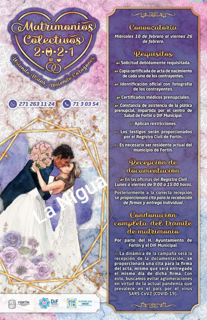 La campaña de recepción de documentos se realizará del miércoles 10 al 26 de febrero de 2021, recibiendo toda la documentación en las oficinas del Registro Civil de Fortín de lunes a viernes en horario de 9 de la mañana 3 de a tarde, para lo que tendrán que presentar los siguientes requisitos: solicitud debidamente elaborada, copia certificada de acta de nacimiento de cada uno de los contrayentes, identificación oficial con fotografía de los contrayentes (INE), certificados médicos prenupciales, constancia de asistencia de la plática prenupcial impartida por el centro de Salud de Fortín o por el DIF Municipal.
