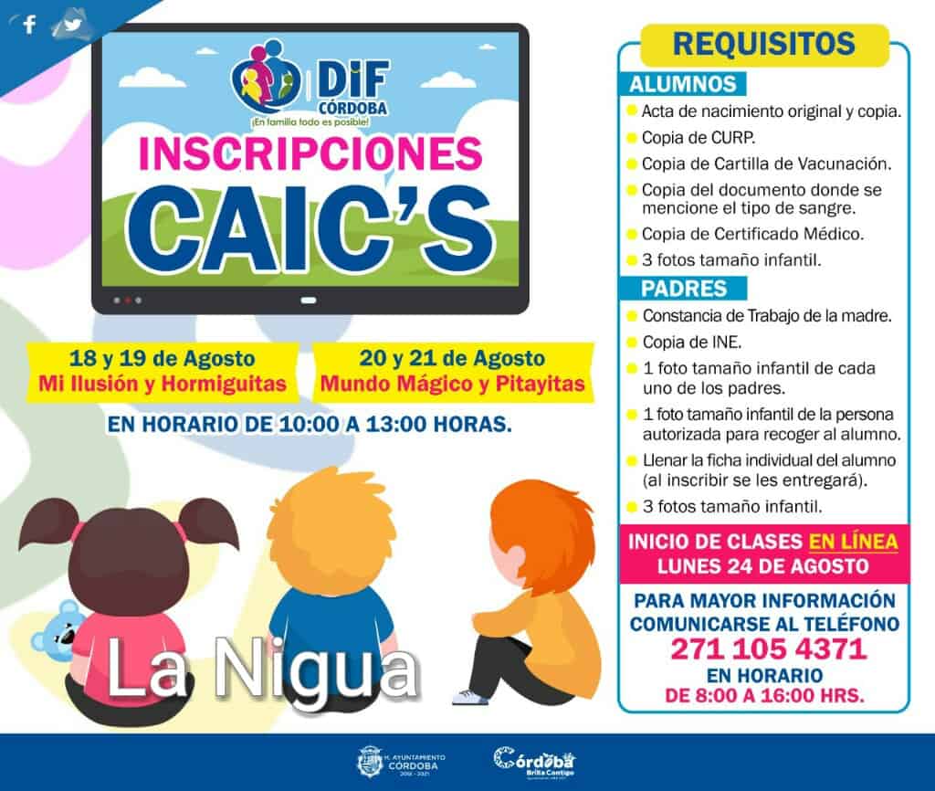 Córdoba, Ver.- Con la finalidad de dar continuidad a los estudios iniciales de nuestras niñas y niños cordobeses a pesar de esta contingencia sanitaria por el COVID-19, el Sistema Municipal para el Desarrollo Integral de la Familia (SMDIF), informa a todos los padres de familia que este martes 18 de agosto iniciará el periodo de inscripciones para los Centros de Asistencia Infantil Comunitarios (CAIC´S).