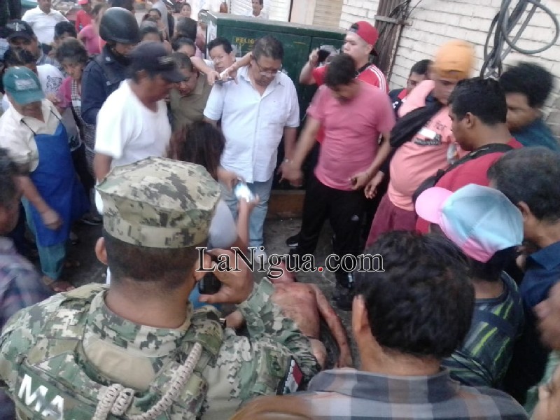 Durante varios minutos las personas desataron toda su ira contra el acusado, quien yacía tirado con los pantalones en los tobillos, el torso desnudo, ensangrentado, escupido y golpeado en la banqueta frente a la entrada del mercado.