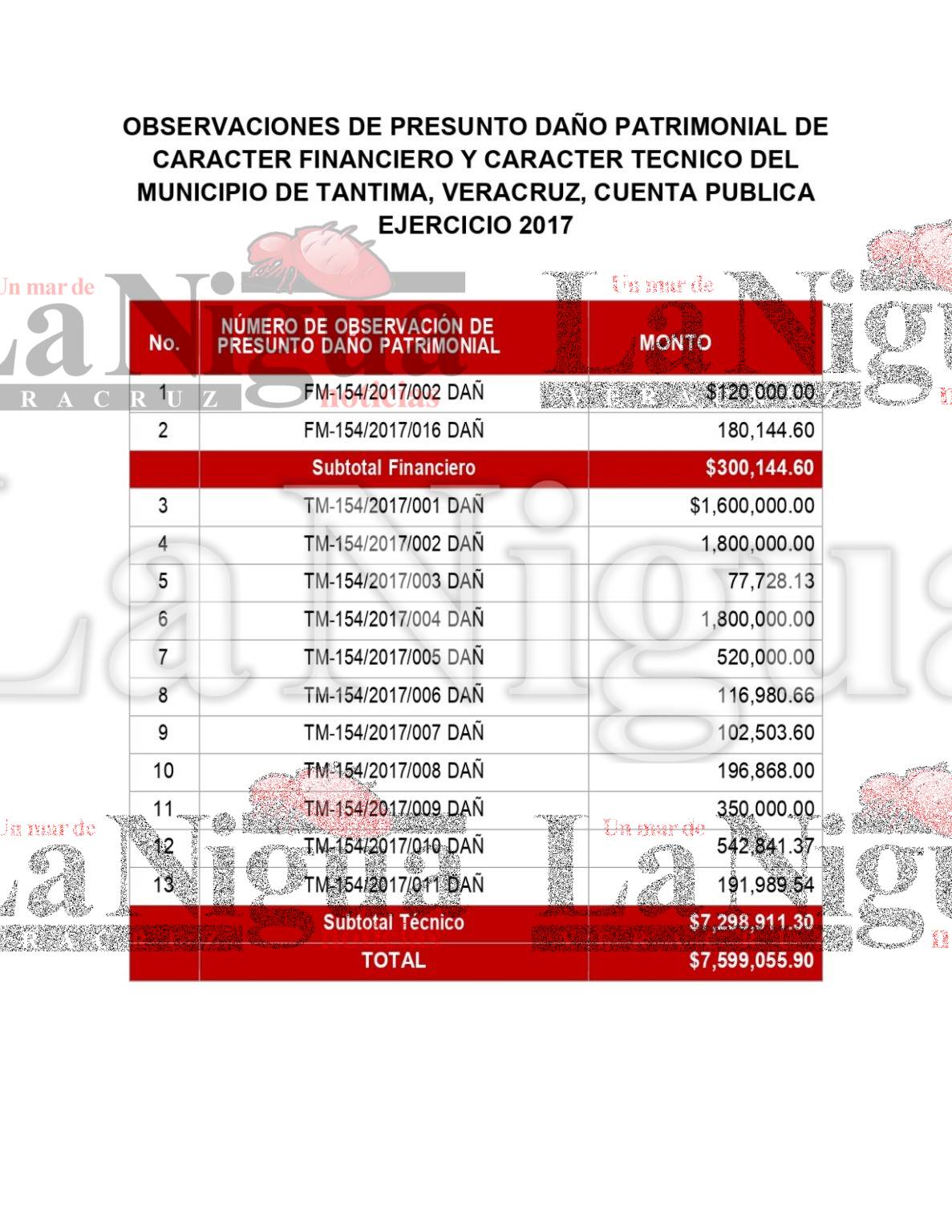 En las “Observaciones de Presunto Daño Patrimonial de Carácter Financiero y Carácter Técnico del Municipio de Tantima Veracruz Cuenta Pública Ejercicio 2017”, realizadas por el Orfis, se indican a detalle el monto, subtotal financiero y total de estas, mediante documentos que ya están en poder de la Fiscalía Especializada en Combate a la Corrupción del Estado de Veracruz, integrados a la Carpeta de Investigación FESP/221/2018/IV-03 de dicha dependencia.