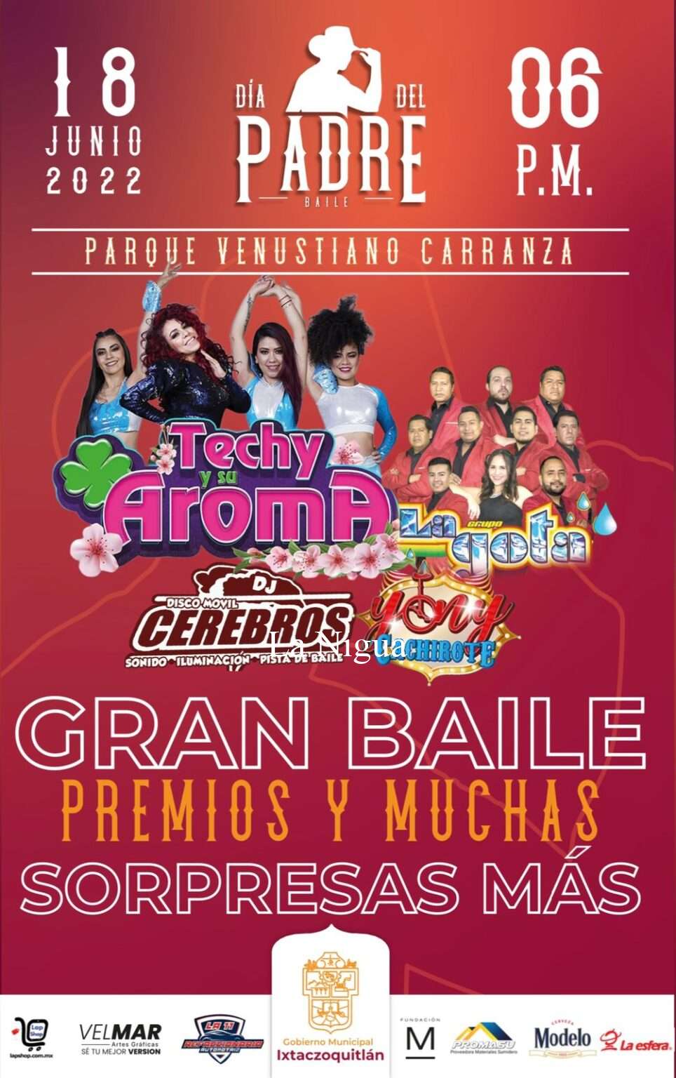 El Presidente Municipal Nahúm Álvarez Pellico, manifiesta que este próximo sábado 18 de junio, estamos invitando a todos los ciudadanos de nuestro municipio, porque vamos a estar celebrando el día del padre, queremos hacer extensiva la invitación, para que a partir de las 6 de la tarde nos acompañen en el parque central “Venustiano Carranza” de la cabecera municipal de Ixtaczoquitlán, porque vamos a estar festejando con un gran baile, en el cual contaremos con la presencia de; Techy y su grupo Aroma, así como Grupo la Gota, y muchas más sorpresas se estarán ofreciendo este próximo sábado