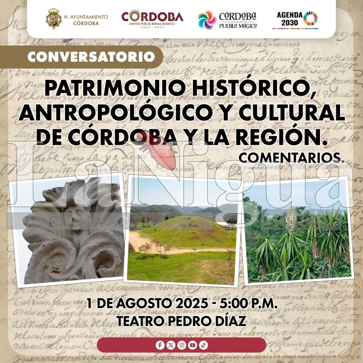 Córdoba, Ver., 31 de julio de 2025.- Buscando nutrir a la población de todos los elementos patrimoniales de la ciudad, el Ayuntamiento llevará a cabo el conversatorio “Patrimonio histórico, antropológico y cultural de Córdoba y la región”, a fin de compartir y destacar aquellos no solo tangibles sino intangibles tales como las costumbres, las tradiciones, la gastronomía y la lengua.