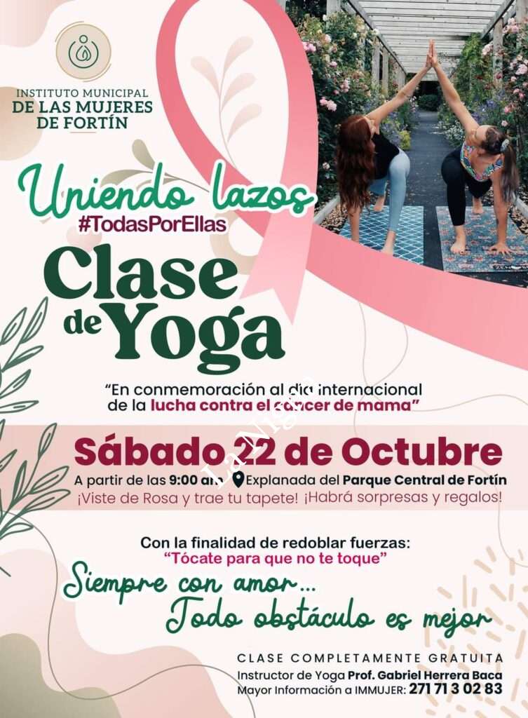 Fortín, Ver. – En conmemoración y con el objetivo de crear conciencia sobre el Día Internacional de la Lucha contra el Cáncer de Mama, el Instituto de la Mujer invita a las mujeres a participar en una clase masiva de Yoga.