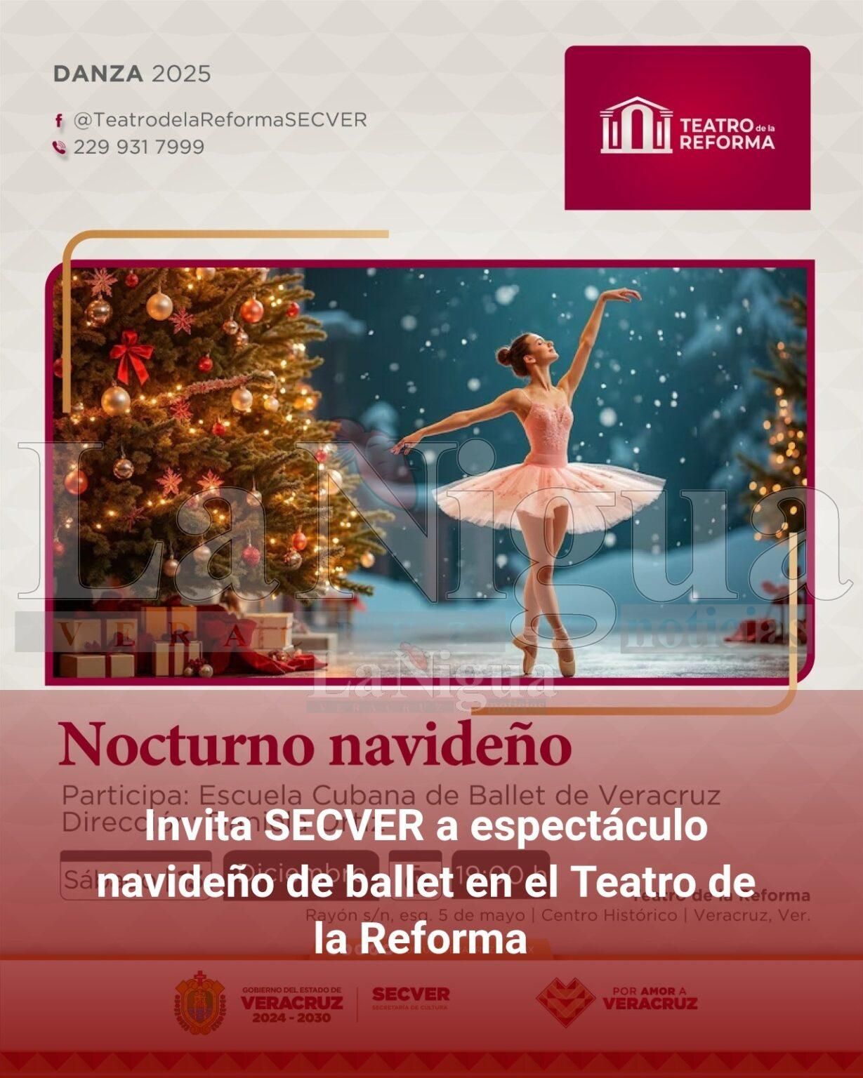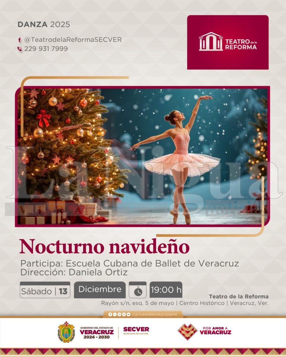 Xalapa, Ver., miércoles 10 de diciembre de 2025.- La Secretaría de Cultura de Veracruz (SECVER) invita al espectáculo de danza Nocturno Navideño, a cargo de la Escuela Cubana de Ballet de Veracruz (Escubaver), el sábado 13 de diciembre a las 19:00 horas en la Sala Principal del Teatro de la Reforma, en el puerto de Veracruz. La entrada es libre.