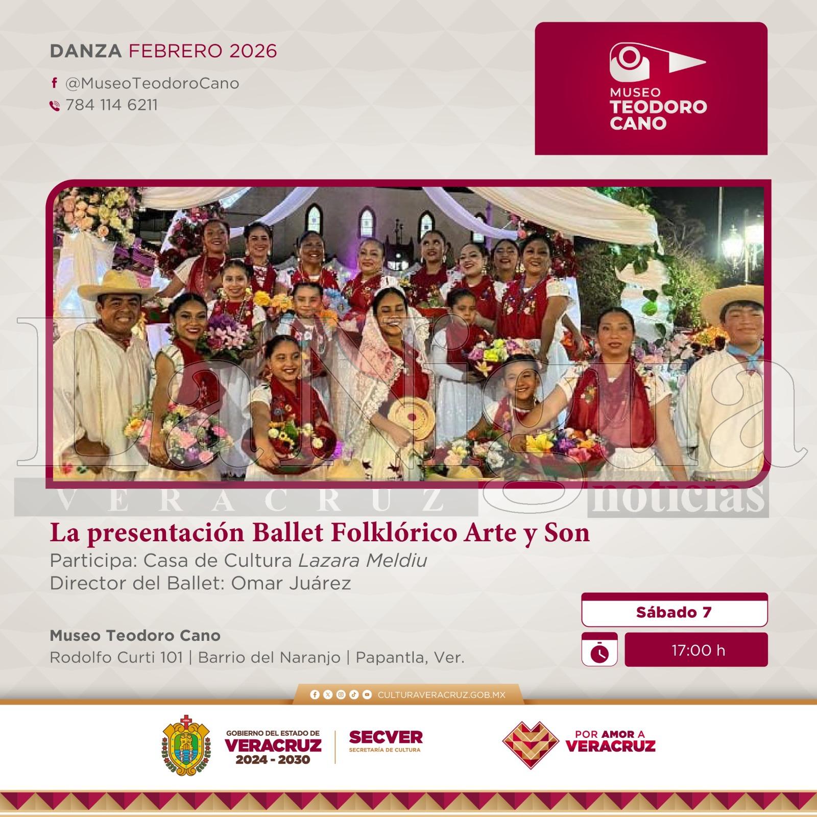 Xalapa, Ver., viernes 06 de febrero de 2026.- La Secretaría de Cultura de Veracruz (SECVER) invita al público en general a asistir a la exhibición de danza del Ballet Folklórico Arte y Son que se llevará a cabo el día sábado 07 de febrero, a las 17:00 horas, en el Museo Teodoro Cano, en Papantla. La entrada es libre.