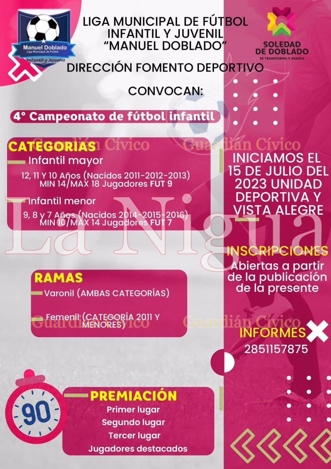 El H. Ayuntamiento SOLEDAD DE DOBLADO y la Dirección de Fomento Deportivo invita a los niños, niñas y jóvenes del municipio y aledaños a participar en la Liga Municipal de Fútbol Manuel Doblado.