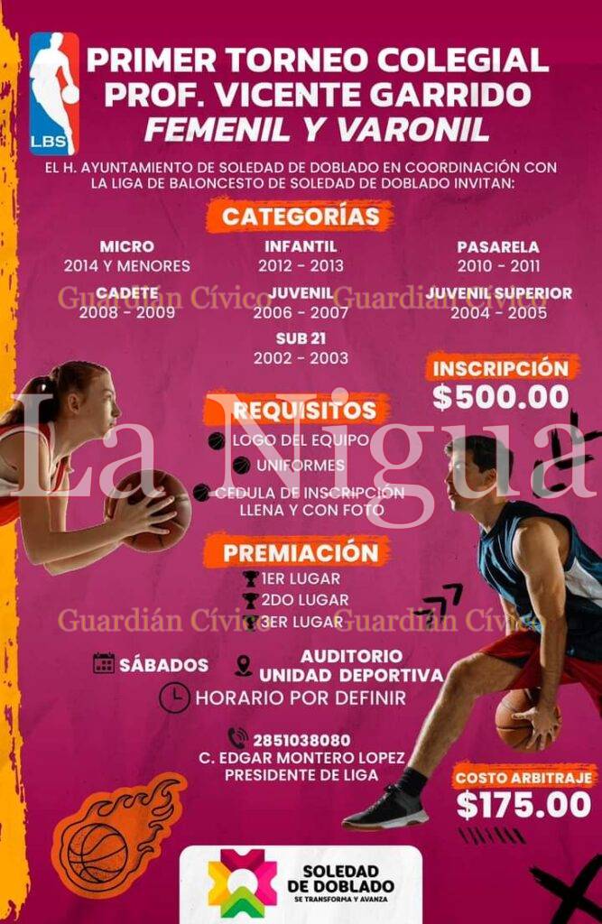 El H. Ayuntamiento en coordinación con la Liga de Baloncesto de Soledad invitamos a niños, niñas y jóvenes del municipio y aledaños a participar en el Primer Torneo Colegial “Prof. Vicente Garrido”.