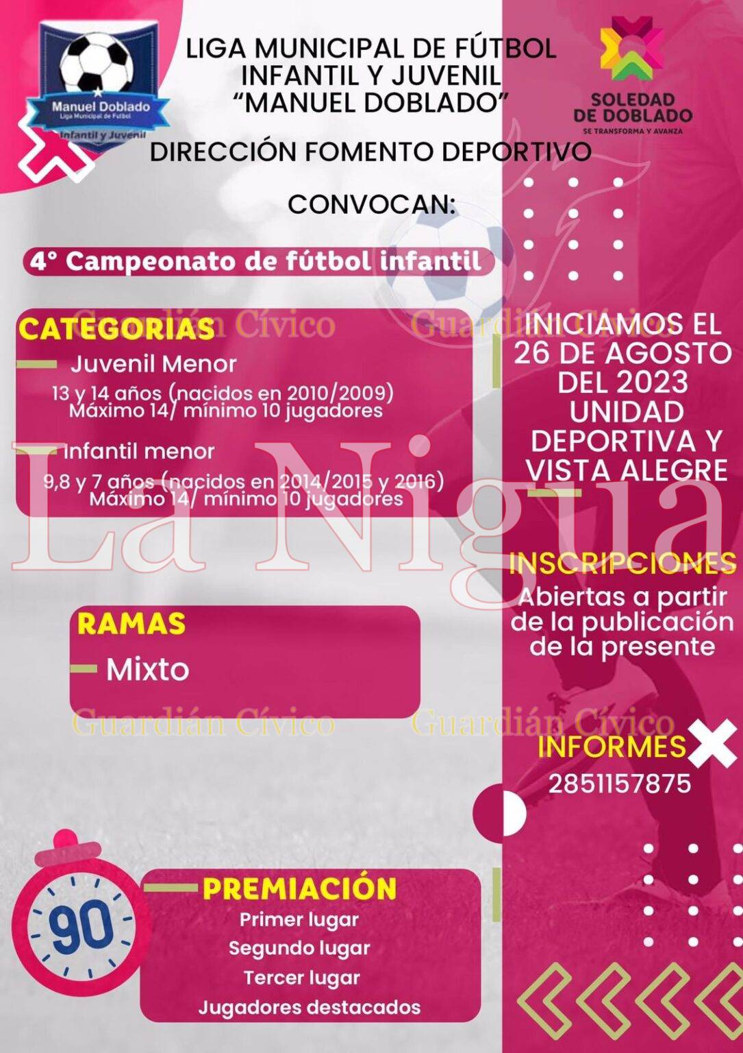 El H. Ayuntamiento y la Dirección de Fomento Deportivo invita a los niños, niñas y jóvenes del municipio y aledaños a participar en la Liga Municipal de Fútbol Manuel Doblado.