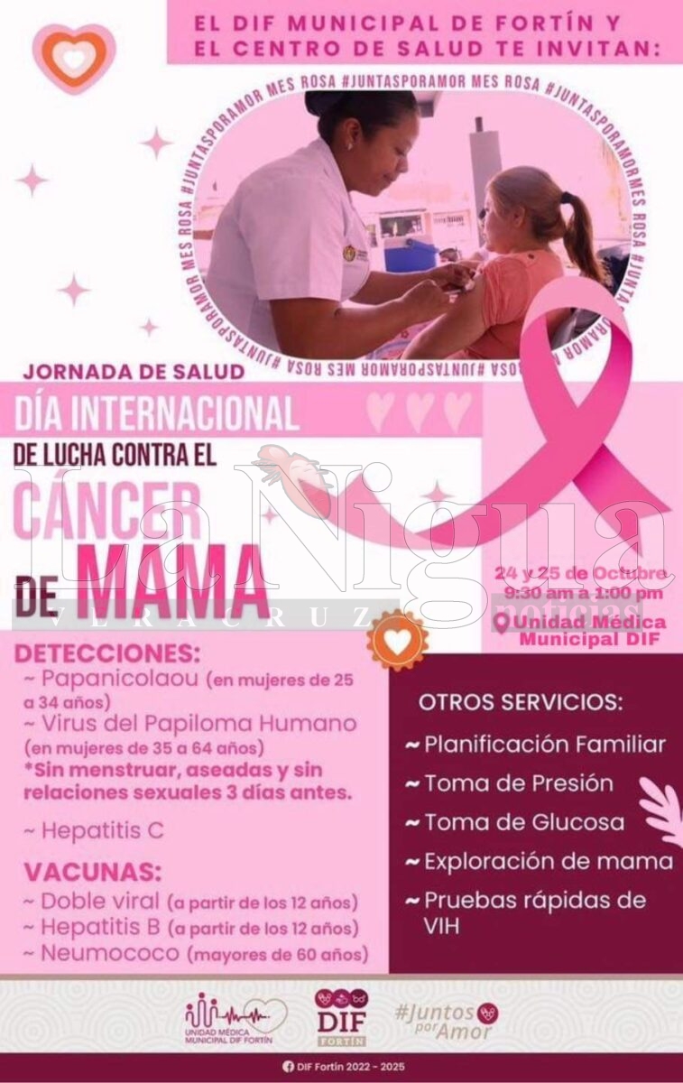 El DIF Municipal de Fortín y el Centro de Salud te invitan a participar en la **Jornada de Salud** en conmemoración del **Día Internacional de Lucha contra el Cáncer de Mama**. Esta es una gran oportunidad para acceder a servicios de salud **totalmente gratuitos**.