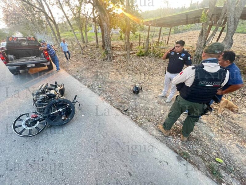 Dos jovenes en motocicleta resultaron con severas lesiones tras chocar contra una camioneta en hechos ocurridos sobre la carretera estatal Tantoyuca – Remanso.