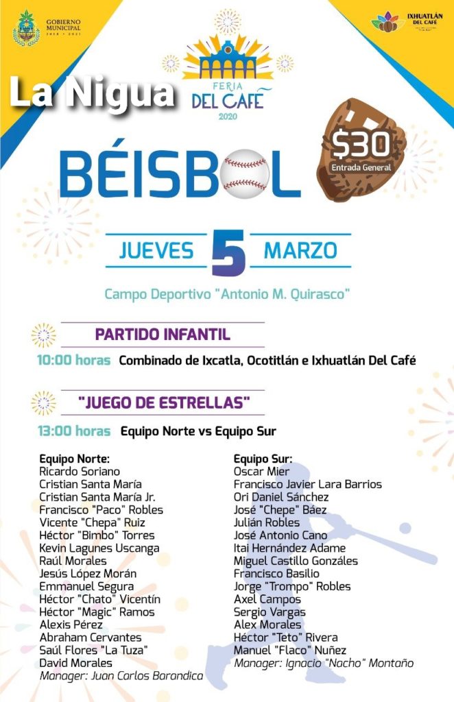En el marco de los festividades de Ixhuatlán del Café, encabezados por su alcaldesa Viridiana Bretón Feito, habrá beisbol de calidad éste cinco de marzo, con un duelo infantil y un Juego de Estrellas.