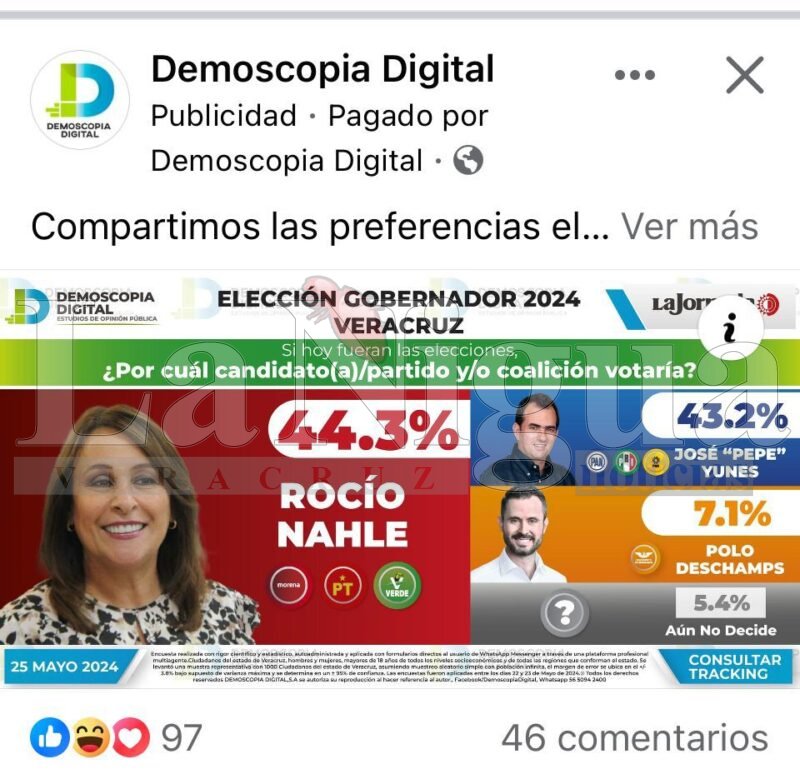 El sondeo que publicó el periódico “La Jornada”, a través de la empresa “Demoscopia Digital”, donde señala que Rocío Nahle tiene las preferencias con un 44.3 por ciento, seguido por Pepe Yunes con un 43.2 por ciento.. Y muy atrás un Polo Deschamps con un 7.1 por ciento.. Sólo deja una REFLEXIÓN.. El medio de comunicación más ligado a Andrés Manuel López Obrador, le “tiró” el discurso de Nahle, de que su candidatura a gobernador aventajaba por más de 25 puntos al peroteño.. ESO SE ACABÓ..