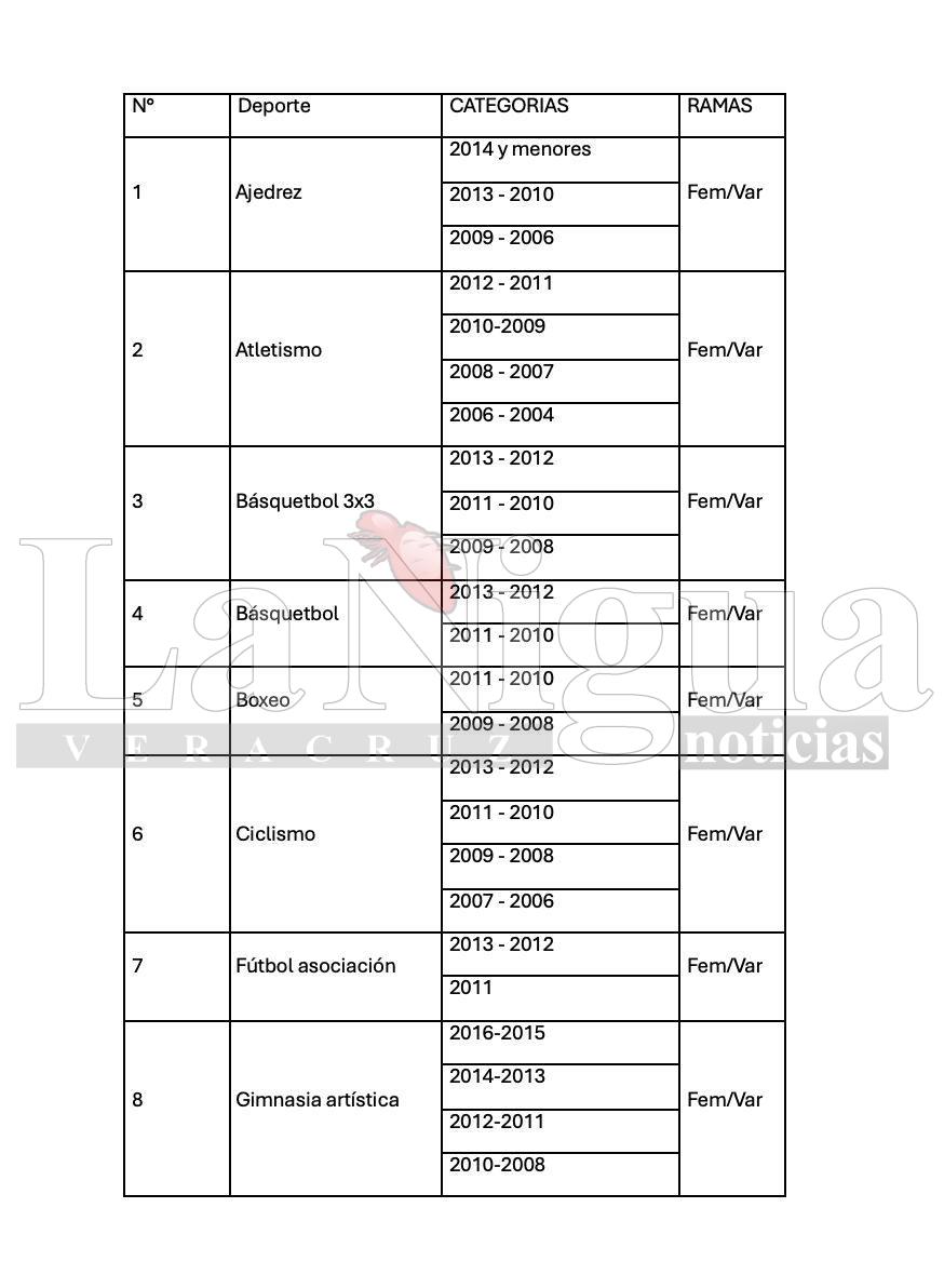 A continuación, las disciplinas deportivas, así como las categorías y ramas de cada una de los deportes: