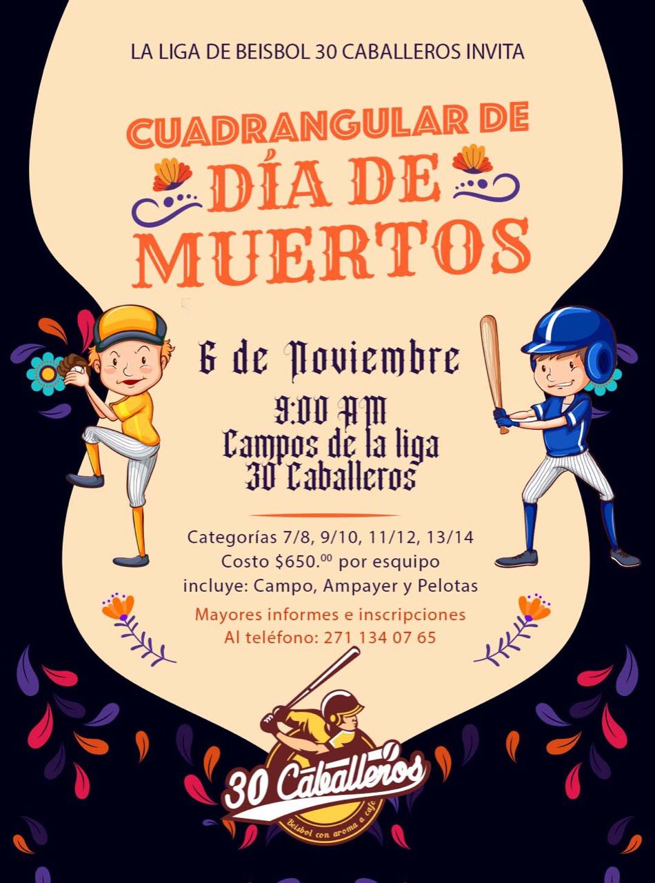 Para mayores informes sobre el cuadrangular Día de Muertos de beisbol infantil y juvenil de la Liga 30 Caballeros, podrán llamar al teléfono 271 134 0765, donde les atenderán e informarán sobre los detalles para participar en este importante torneo de beisbol infantil y juvenil.