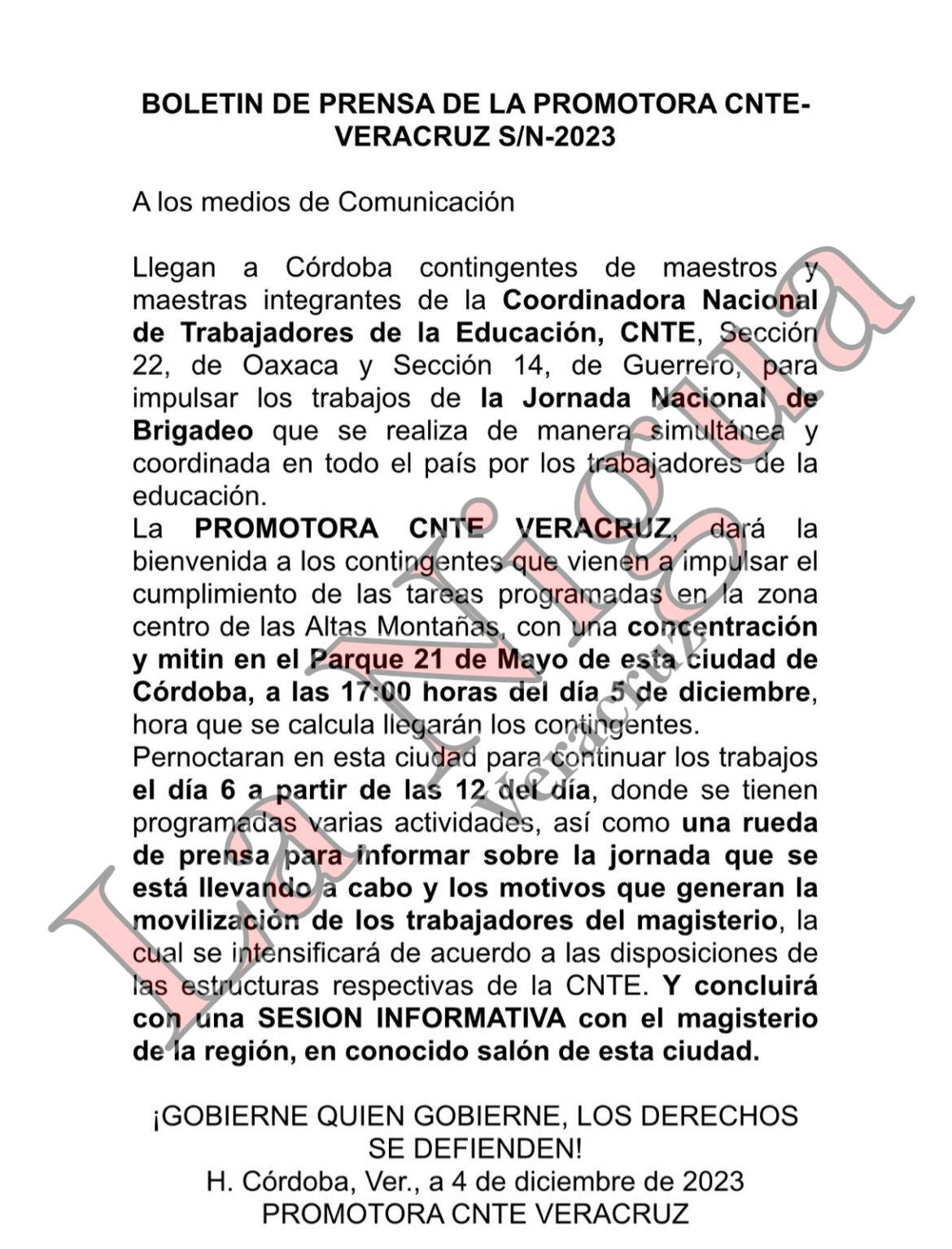 La PROMOTORA CNTE VERACRUZ dará la bienvenida a los contingentes que vienen a impulsar el cumplimiento de las tareas programadas en la zona centro de las Altas Montañas, con una concentración y mitin en el Parque 21 de Mayo de esta ciudad de Córdoba, a las 17:00 horas del día 5 de diciembre, hora que llegarán los contingentes.