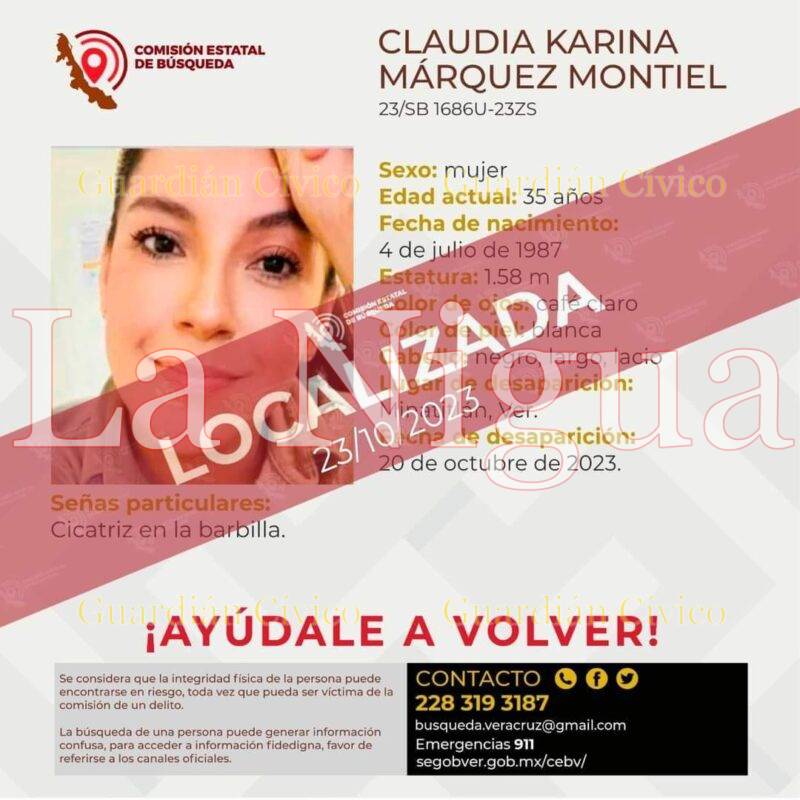 Claudia Karina Márquez Montiel de 35 años, joven de Minatitlán que había sido reportada desde el pasado viernes 20 de octubre, presuntamente fue localizada este día, esto de acuerdo a la actualización de la ficha de la Comisión Estatal de Búsqueda del Estado de Veracruz donde ya aparece como localizada.