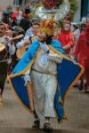 Y por ultimo la vestimenta de Caifás; Túnica blanca hasta el tobillo con flequillo dorado, capa azul rey hasta el tobillo con flequillo dorado, cordel azul rey o blanco, corona artesanal tipo monarquía europea, máscara de mica o tela, espada de madera (decorada o lisa), calcetas blancas y huaraches.
