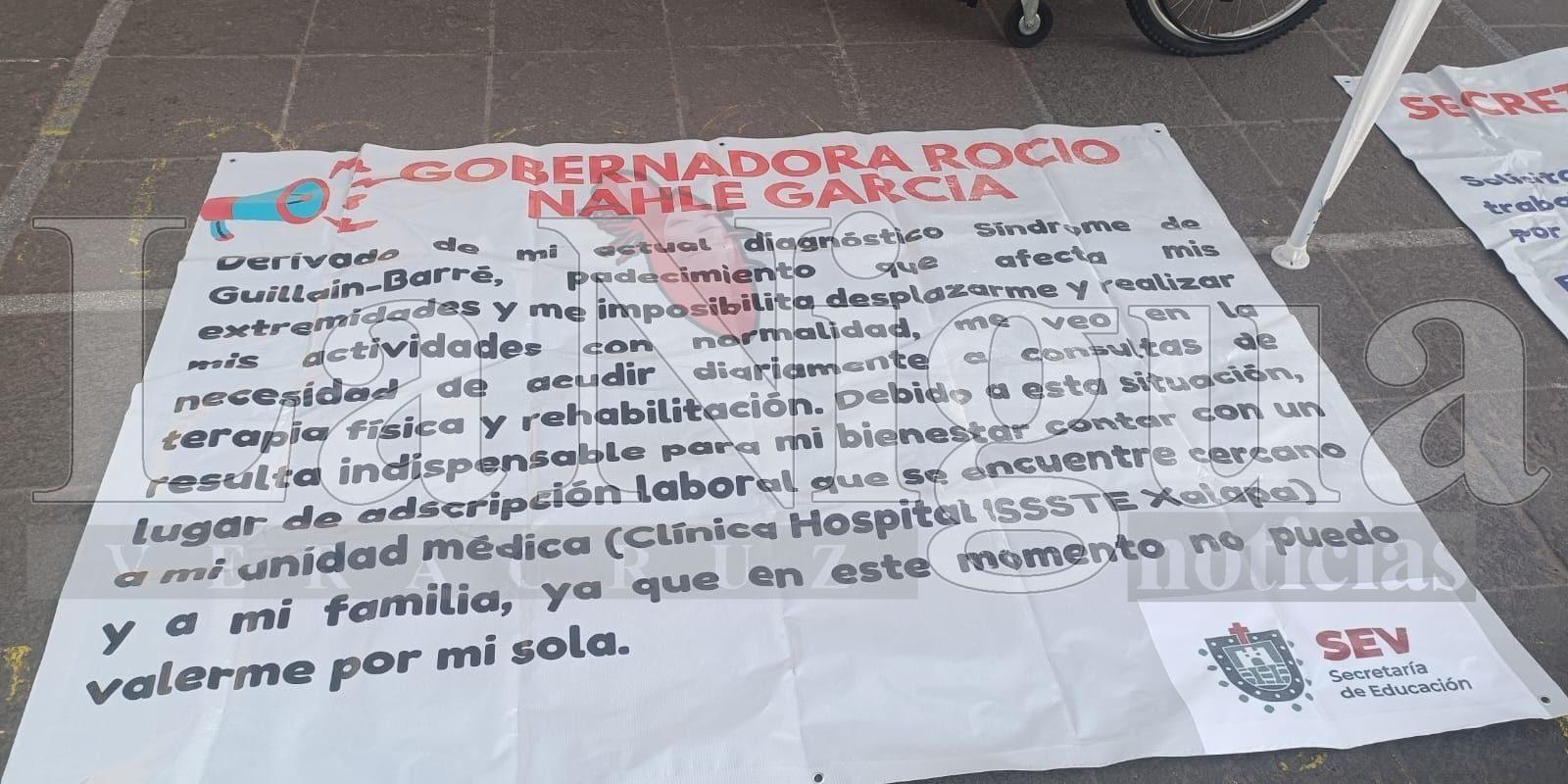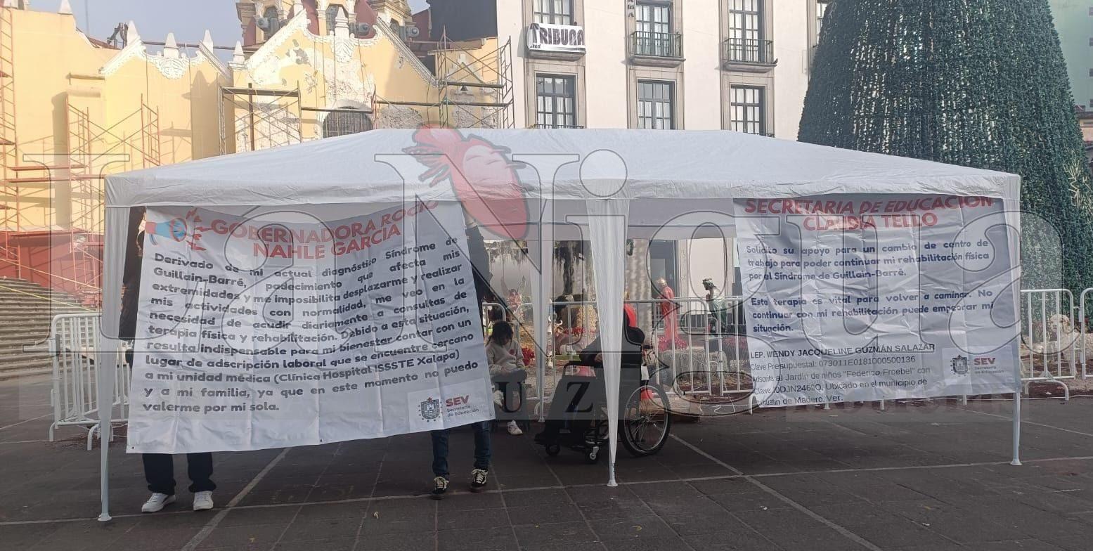 Xalapa, Ver.— En silla de ruedas y acompañada de su familia, la maestra de nivel preescolar federal Wendy Jacqueline Guzmán Salazar se manifestó de manera pacífica en la Plaza Lerdo, para solicitar un cambio de adscripción a la ciudad de Xalapa, luego de que hace cinco meses fuera diagnosticada con el síndrome de Guillain-Barré, enfermedad que afecta severamente la movilidad muscular.