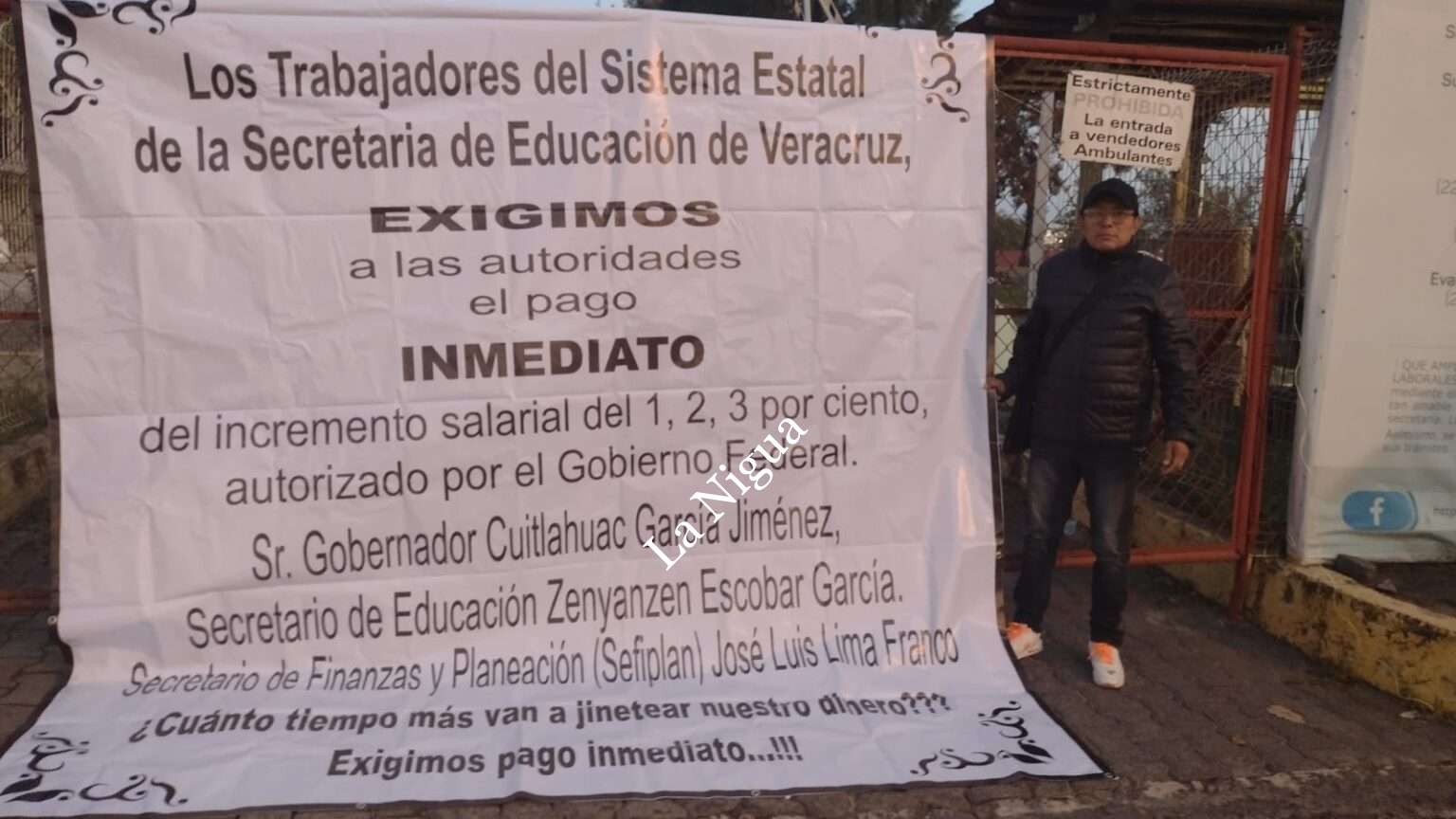 Así también “no es posible que el titular de esta secretaría de educación de Veracruz, Zenyazen Roberto Escobar García, diga que la federación no ha depositado ni un solo peso, para este pago a la secretaría de finanzas y Planeación de Veracruz (SEFIPLAN), y lo diga un día antes del pago de la quince 20, por lo tanto aquí vamos a seguir en la lucha hasta que se nos pagué este incremento del cuál tenemos derecho”.Los manifestantes colocaron lonas con varias consignas a su petición en las entradas y salidas de este depedendecia estatal.