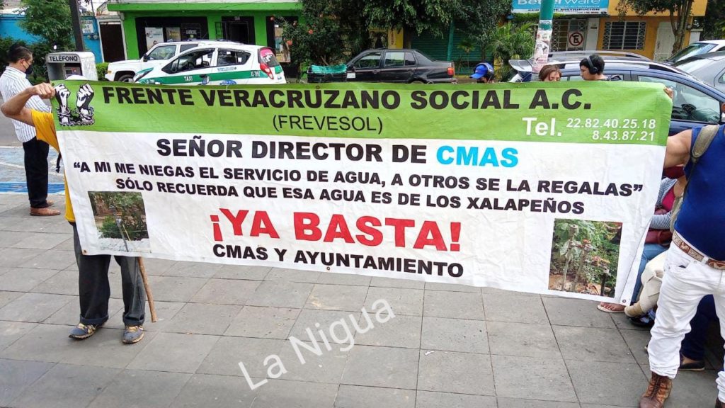 Integrantes del frente veracruzano social ( FREVESOL), se están manifestando en las afueras de las oficinas de la comisión municipal de agua y saneamiento de Xalapa (CMAS), vienen a exigir al director de esta dependencia municipal. Jorge Ojeda Gutiérrez, ya de la orden para que se contraten 22 tomas domiciliarias de agua potable para las colonias valle del sumidero y bosques de las Lomas de esta ciudad de Xalapa, así lo informó el presidente de este frente, Carlos Hernández Arriaga.