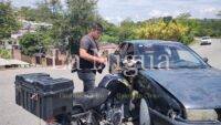 El motorista terminó impactándose sobre el costado derecho del vehículo Nissan, Tsuru, de color azul marino, por lo que resultó lesionado.