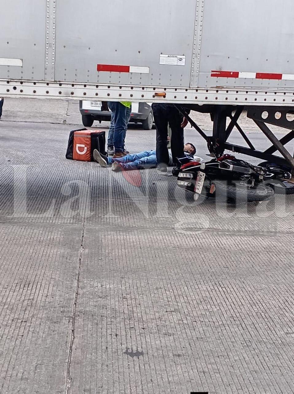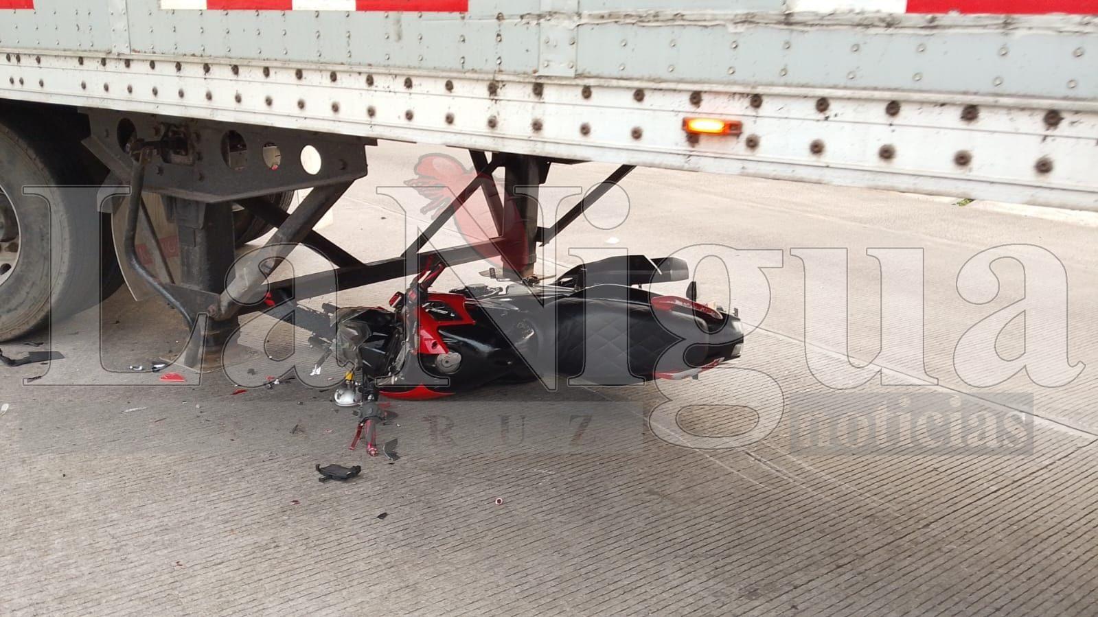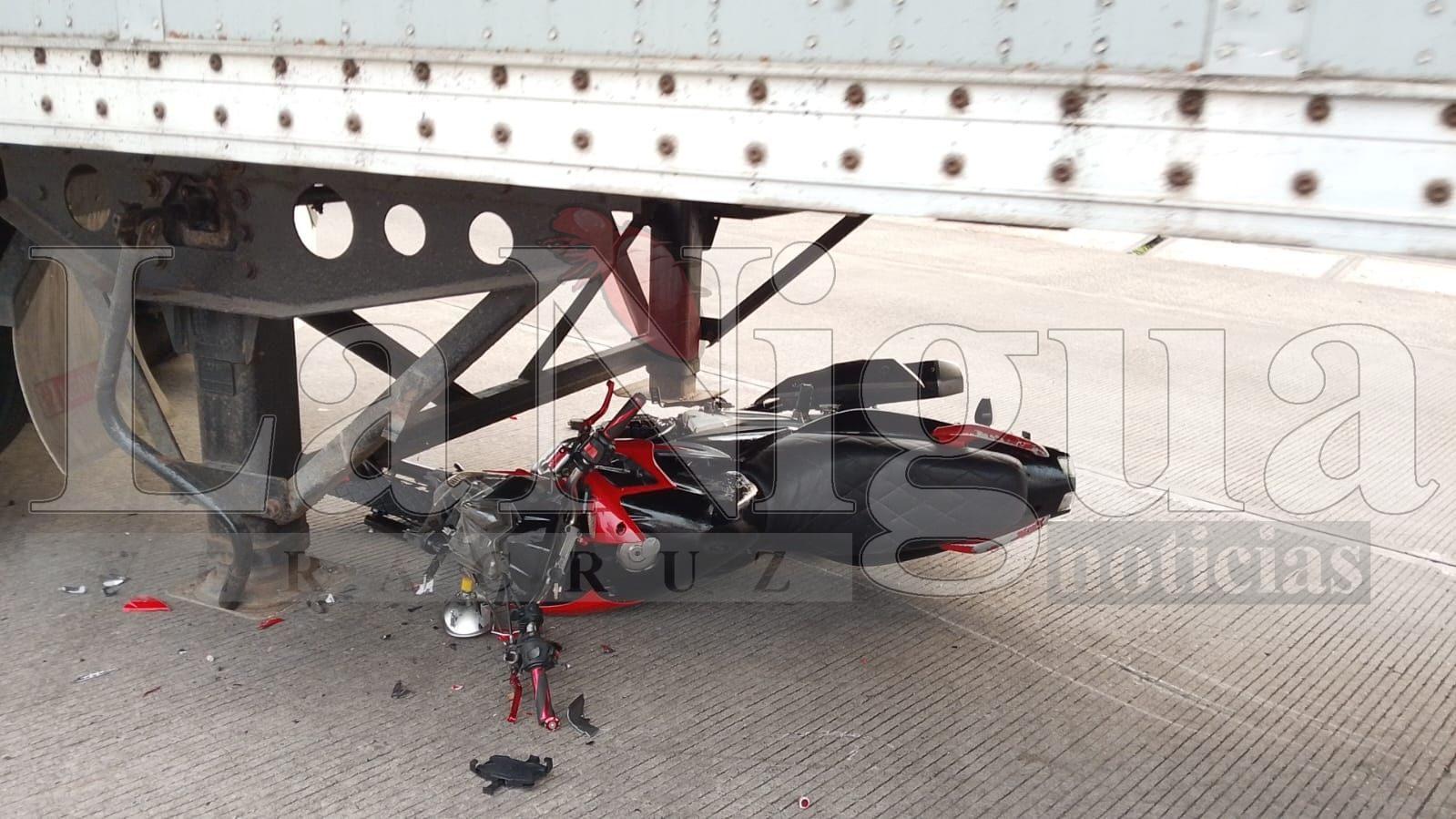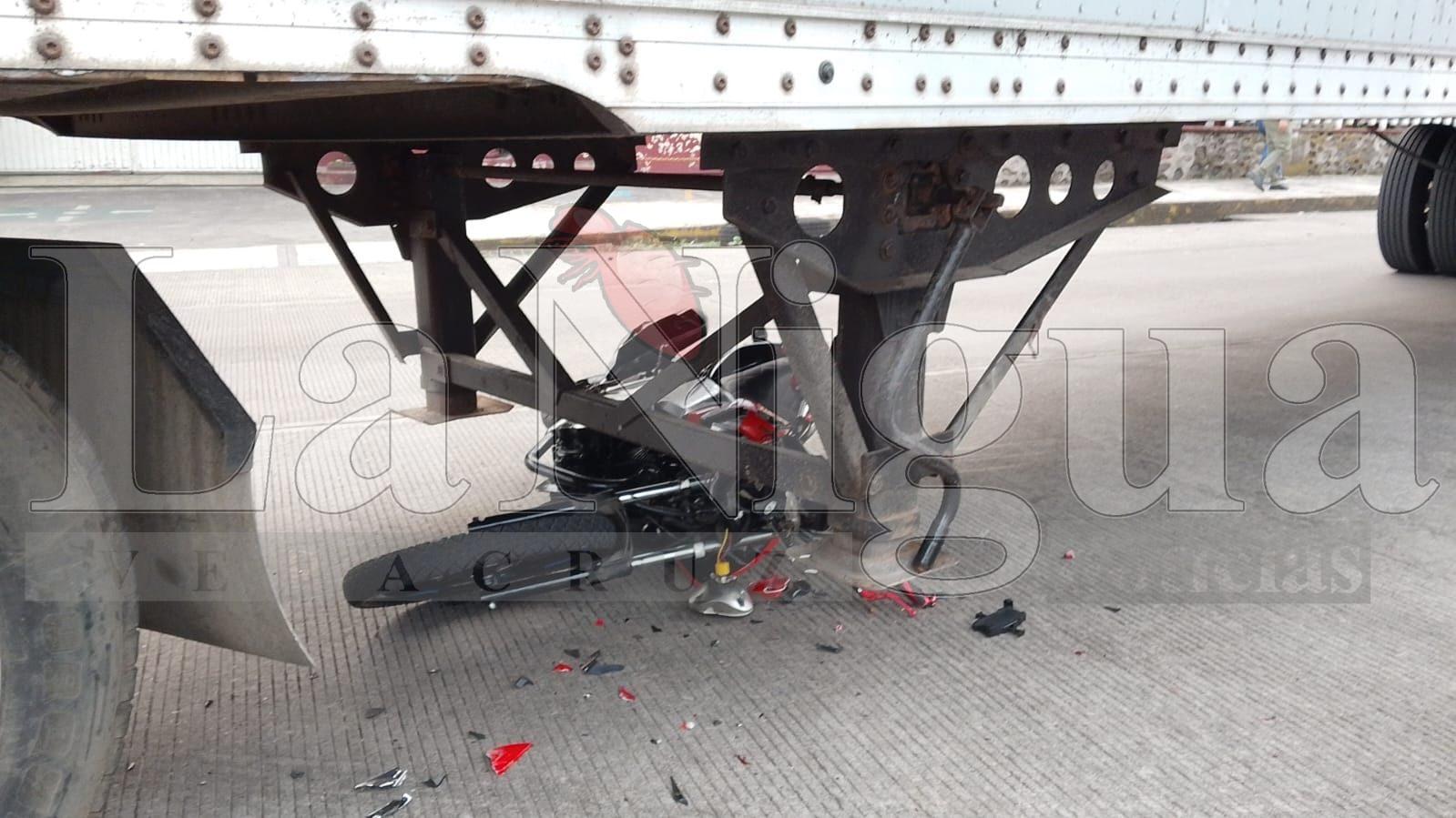 Durante el incidente, la motocicleta terminó impactándose y quedó atorada debajo de la caja del vehículo de carga.