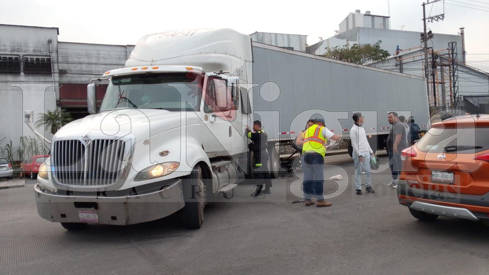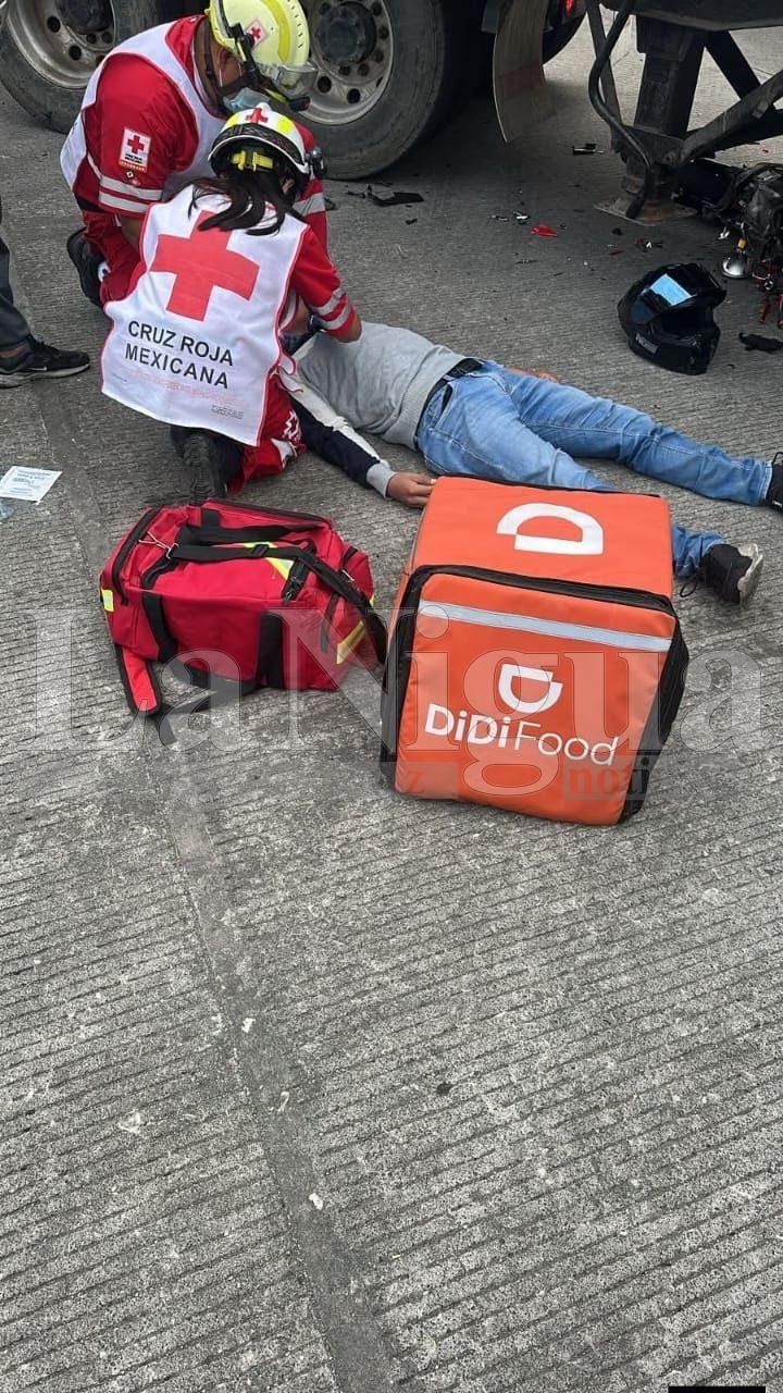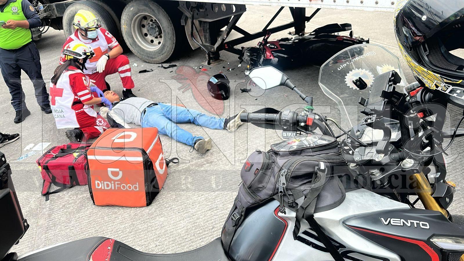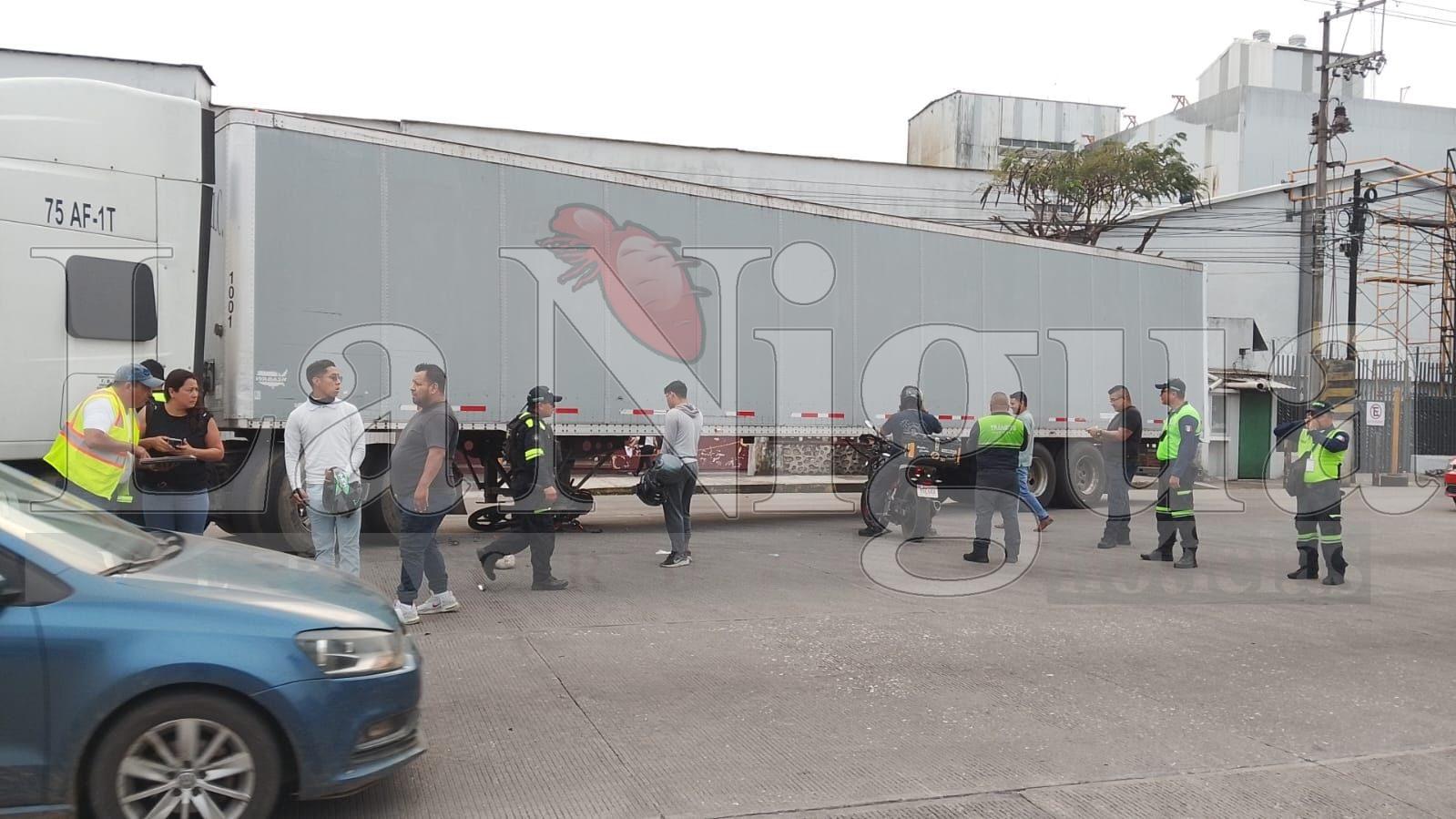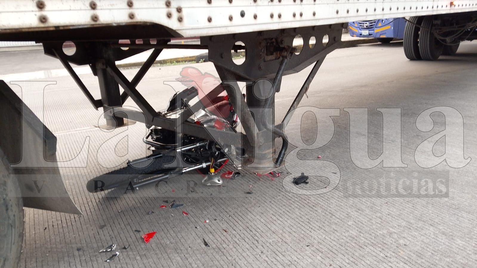 Durante el incidente, la motocicleta terminó impactándose y quedó atorada debajo de la caja del vehículo de carga.