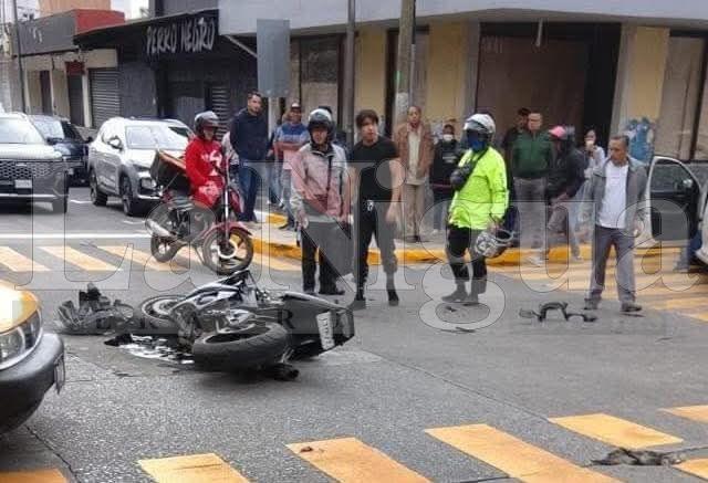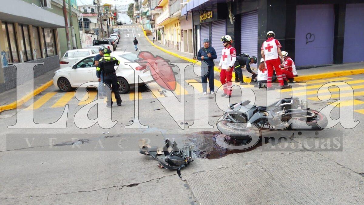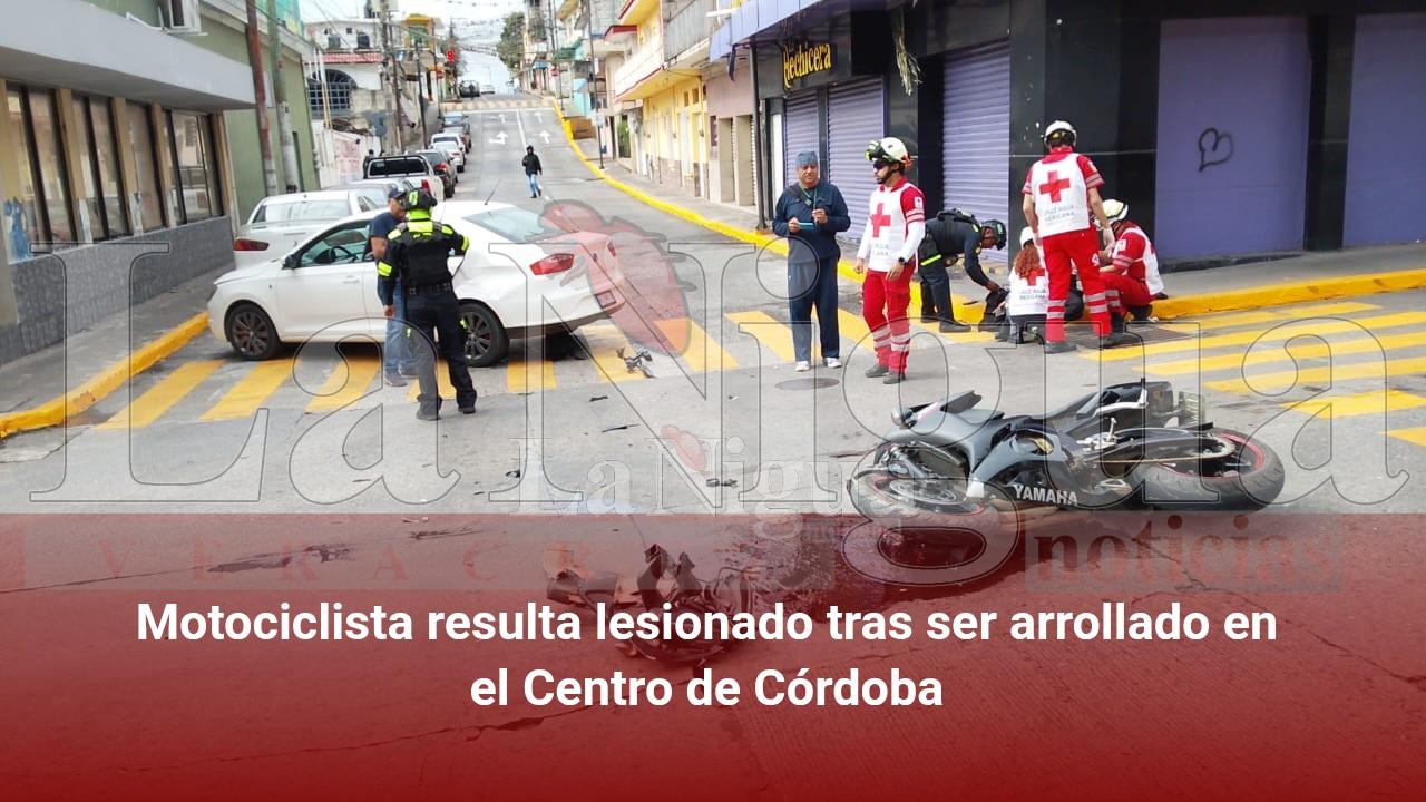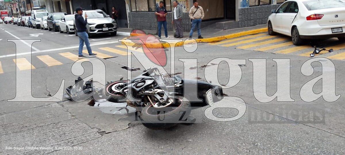 Córdoba, Ver.— La mañana de este martes se registró un fuerte accidente vial en pleno corazón de la ciudad, luego de que un motociclista fuera impactado por un vehículo particular sobre la avenida 5, casi en la esquina con calle 4, una de las zonas con mayor afluencia peatonal y vehicular.