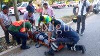 El taxista dijo a las autoridades que el motociclista le invadió carril chocandolo de frente y dañandole parte de la salpicadera frontal, mientras que el motociclista quedó tendido y con una posible fractura en una de sus piernas.
