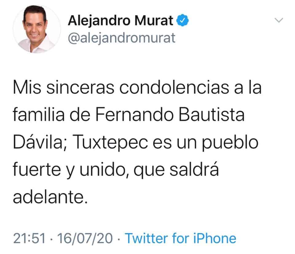 Fernando Bautista Dávila alcalde de Tuxtepec, Oaxaca falleció este día tras complicaciónes en su salud por COVID19, así lo confirmó el Gobernador del Estado de Oaxaca, Alejandro Murat vía redes sociales donde externó sus condolencias a los familiares del edil.[/vc_column_text][/vc_column][/vc_row]