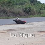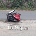 La motocicleta en la que iban quedó materialmente desecha, despedazada en cuatro partes y los cascos de la pareja también volaron a varios metros de distancia con masa encefálica en su interior.