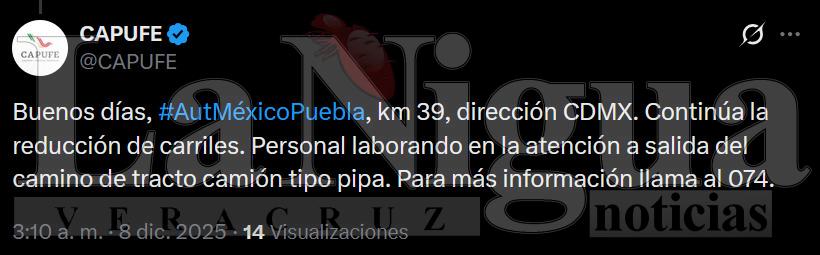 Esta madrugada de lunes, la autopista México-Puebla sigue con reducción de carriles según CAPUFE (074).