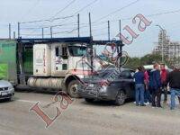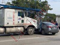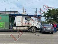 El susto de su vida se llevó una mujer, quien al conducir su automóvil fue impactada por un vehículo de carga doble remolque de los llamados “nodrizas”, empleados para el traslado de automóviles nuevos.