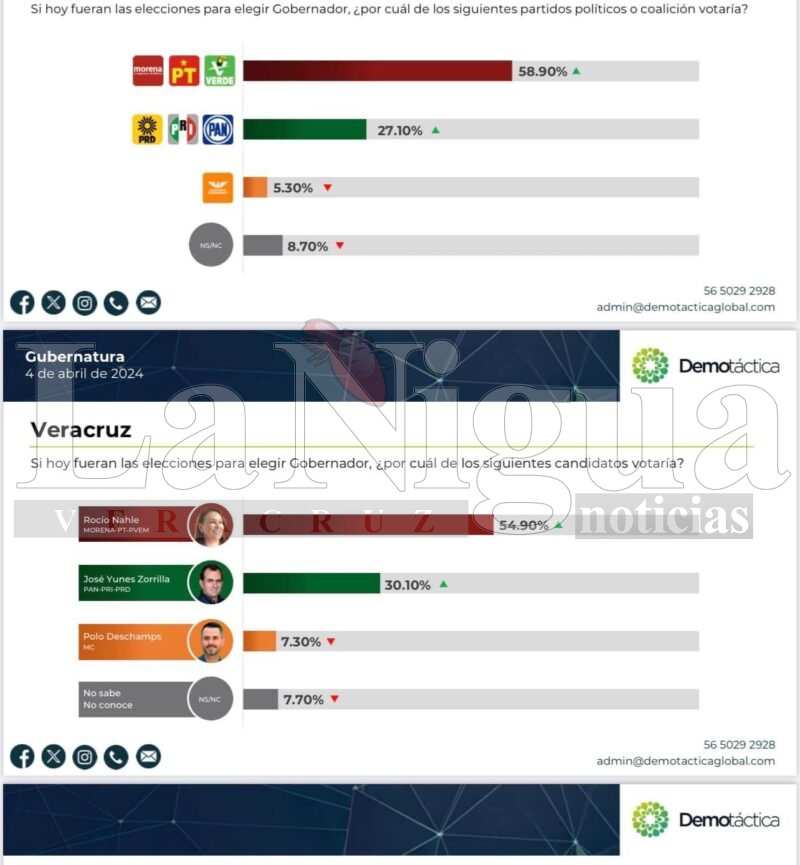 Xalapa, Ver. 5 de abril de 2024.- En una nueva encuesta elaborada por Demotáctica, la empresa galardonada con el premio Reed Latino Awards por ser una de las dos mejores encuestadoras de México, se ratifica la tendencia positiva de Rocío Nahle García, quien, de acuerdo al estudio, supera por 24 puntos a José Yunes Zorilla en la elección a gobernador de Veracruz.