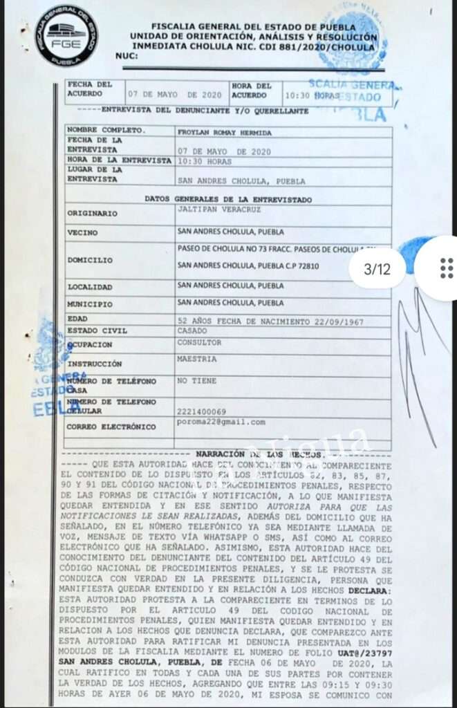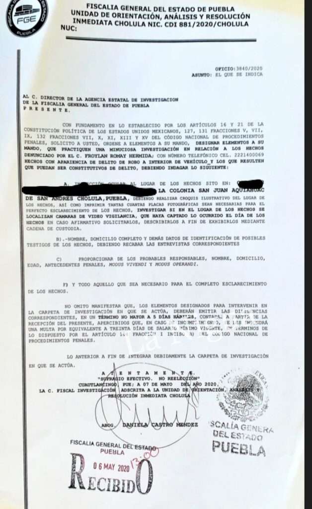 1. Aclares públicamente y de inmediato que donde dice “…un sujeto llamado FROYLÁN ROMAY HERMIDA” debe decir “…un sujeto que presuntamente dijo llamarse FROYLÁN ROMAY HERMIDA”; asimismo, te pido que indiques que quien realmente ostenta el nombre de FROYLÁN ROMAY HERMIDA presentó, el 6 de mayo de 2020 (fecha bastante previa a los hechos), DENUNCIA DE HECHOS CON APARIENCIA DE DELITO DE ROBO A INTERIOR DE VEHÍCULO que te adjunto y que te autorizo desde ya para que la publiques en tu medio, por ser la difusión de donde surgió la nota de origen.