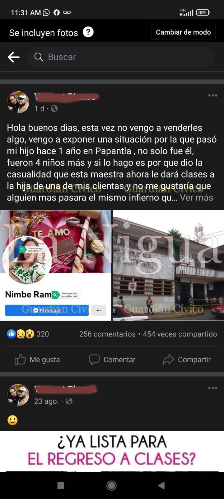 PAPANTLA, VER.- (Agosto 31 del 2023) Tras la denuncia, que fuera realizada por parte de una madre de familia de un ex alumno de la escuela primaria “María Gutiérrez” de esta ciudad a través de las redes sociales contra una docente de dicha institución educativa, que fue identificada por la quejosa como NIMBE “N”, a quien señaló haber causado presuntamente daños psicológicos a su hijo, quién fuera agredido en forma verbal; al no autorizar ir al baño del plantel, ocasionando qué siempre regresará con su uniforme sucio al domicilio familiar.