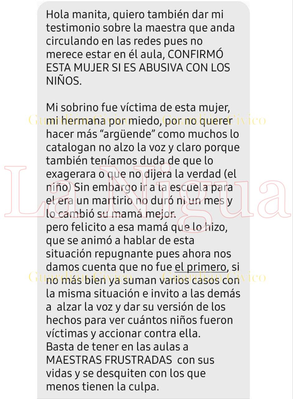 Otros 10 padres y madres de familia, manifestaron estás acusaciones, relataban sus hijos haber sufrido la misma situación por parte de dicha docente y señalaban que las autoridades educativas no habían hecho nada al respecto.