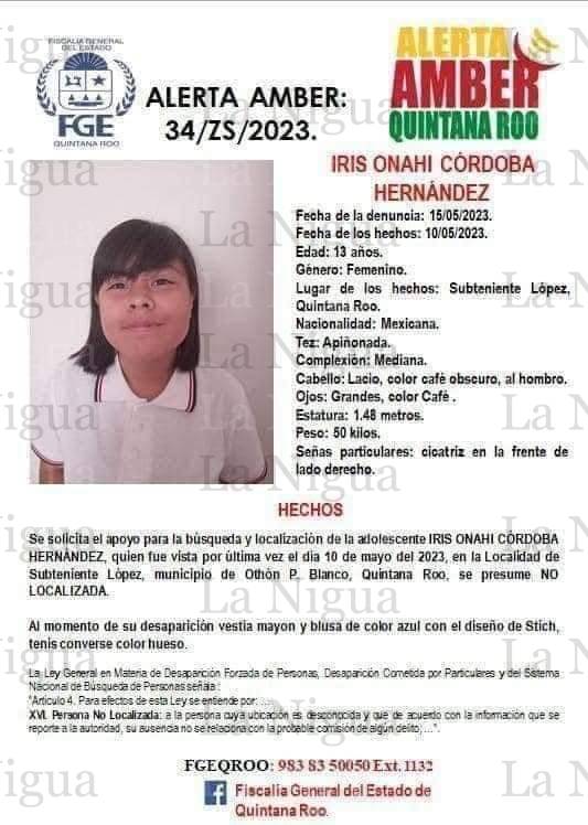 Iris Onahí Córdoba Hernández fue reportada desaparecida el 10 de mayo pasado, tras ir con su familia a un rancho ubicado en la selva de Subteniente López.