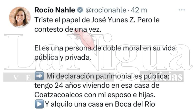 De igual manera, Rocío Nahle aclaró que renta una casa en Boca del Río porque su residencia oficial es Coatzacoalcos, hecho que incluso, precisó en su red social X.