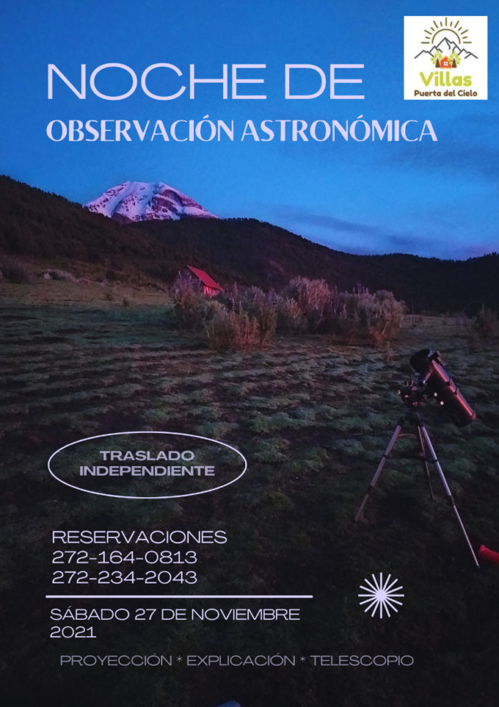 El evento se llevará a cabo el día sábado 27 de noviembre de 2021 a partir de las 18:00 horas hasta la madrugada del día siguiente en Villas Puerta del Cielo. Se contará con dos telescopios y brindará información necesaria sobre los cuerpos celestes a observar entre los que destacan Júpiter, Saturno, las Pléyades, la galaxia de Andrómeda, entre otros. El cupo será limitado, la entrada gratuita y se solicita la cooperación voluntaria de dulces para los niños de San Miguel Pilancón. El traslado a Villas Puertas del cielo es independiente, así como la reservación de las cabañas a los números 2721640813 y 2722342043.