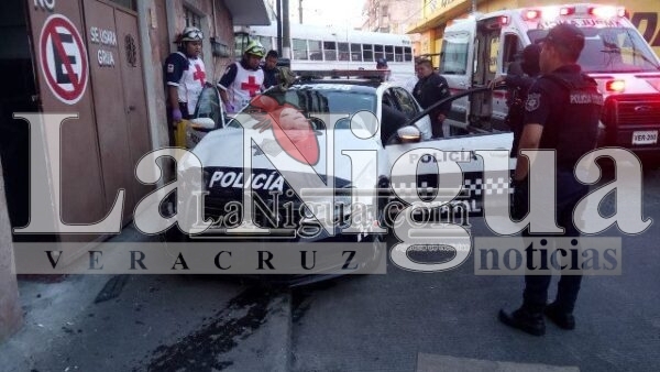 Córdoba, Ver.- Un oficial lesionado, pasajeros con crisis nerviosa, daños materiales por 40 mil pesos y bloqueo de la vialidad, fue el saldo de un choque entre un vehículo de la Policía Estatal y una unidad de pasaje en la avenida 4 y calle 17 de la colonia centro.