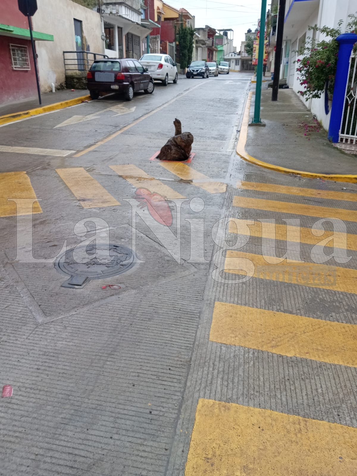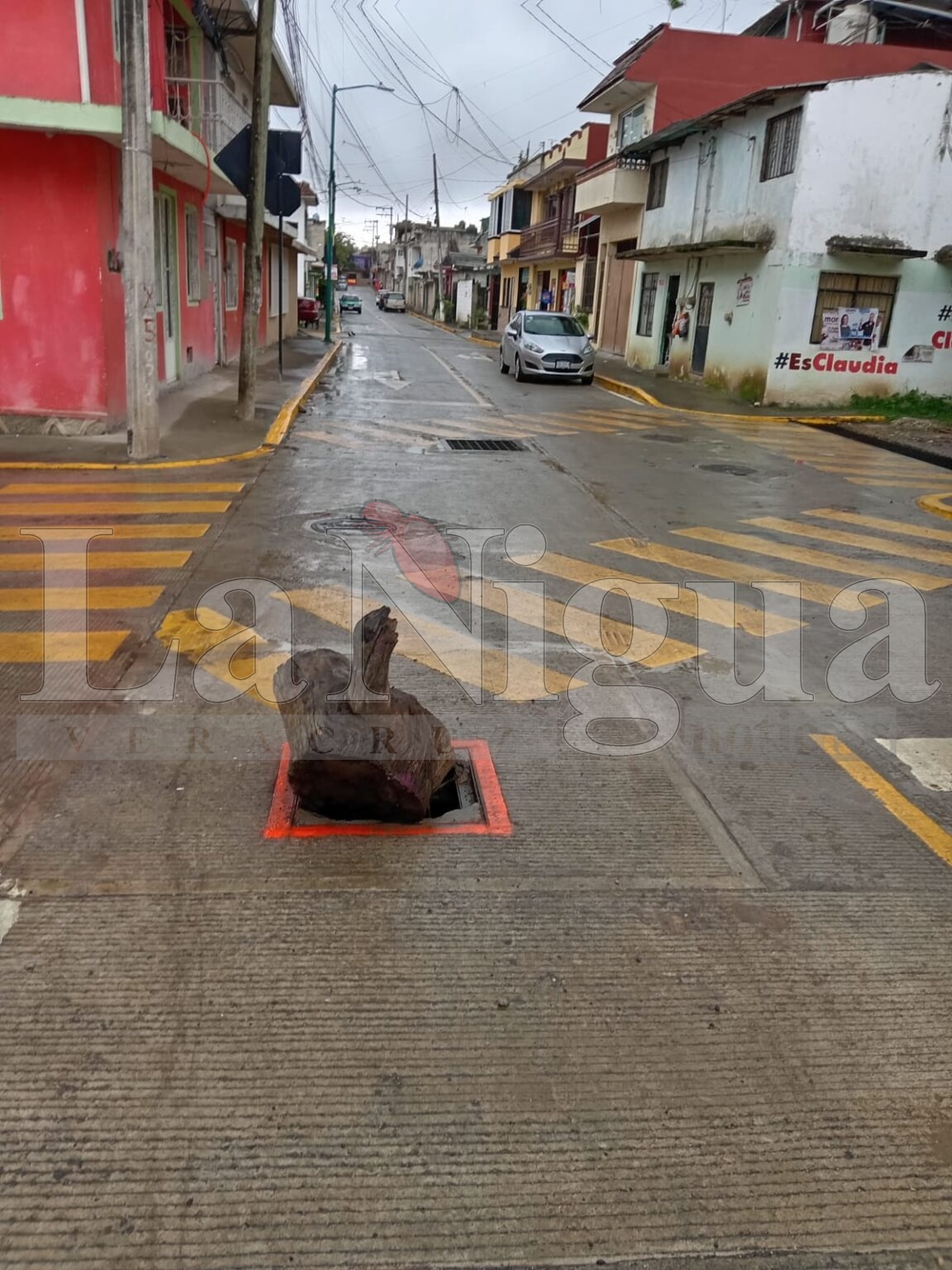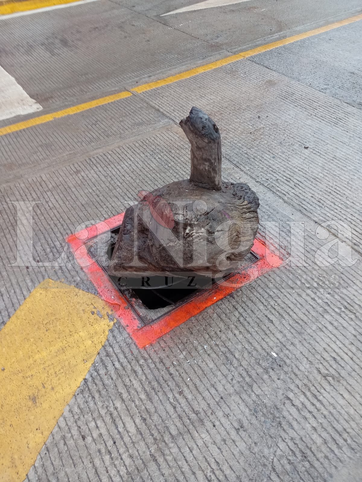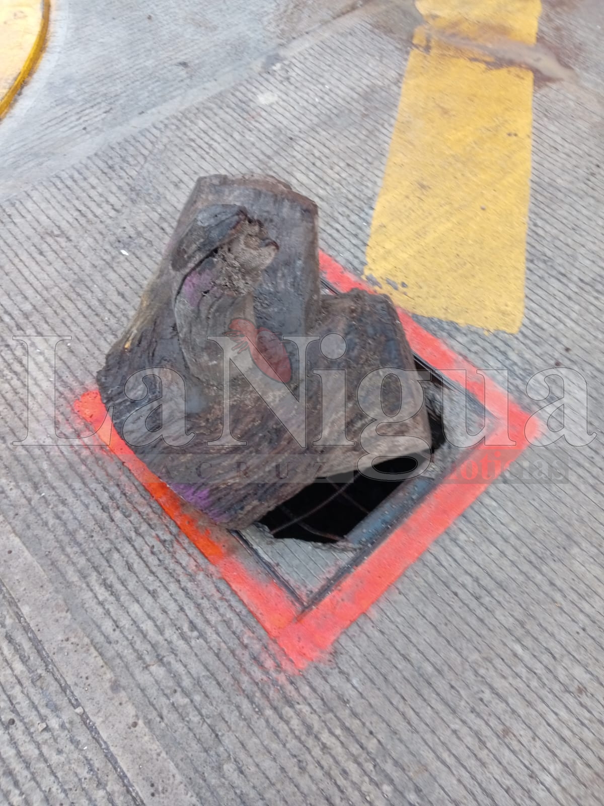 Un ciudadano intentó prevenir accidentes colocando un tronco de madera en el registro. Sin embargo, esta mañana, un camión de limpia pública golpeó el tronco, hundiéndolo aún más en el registro. Esto aumenta el riesgo de que el tronco dañe la válvula, lo que podría resultar en la pérdida de miles de litros de agua potable.