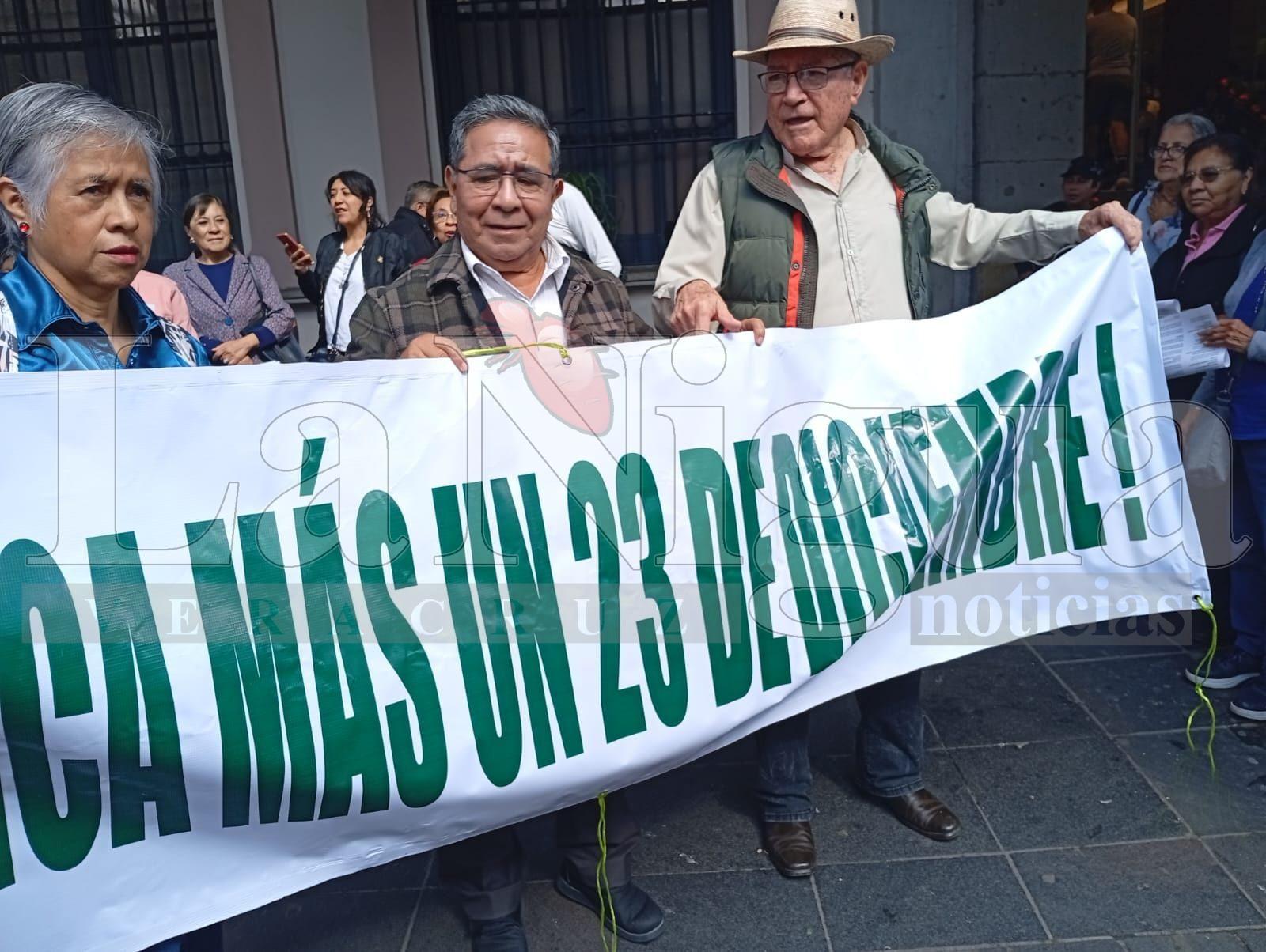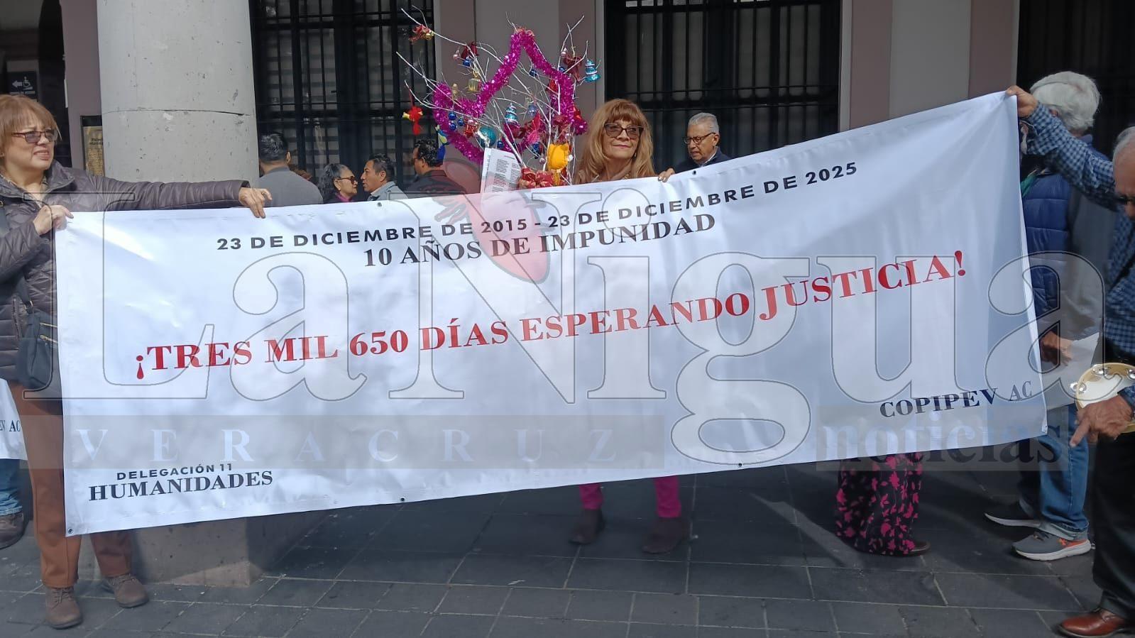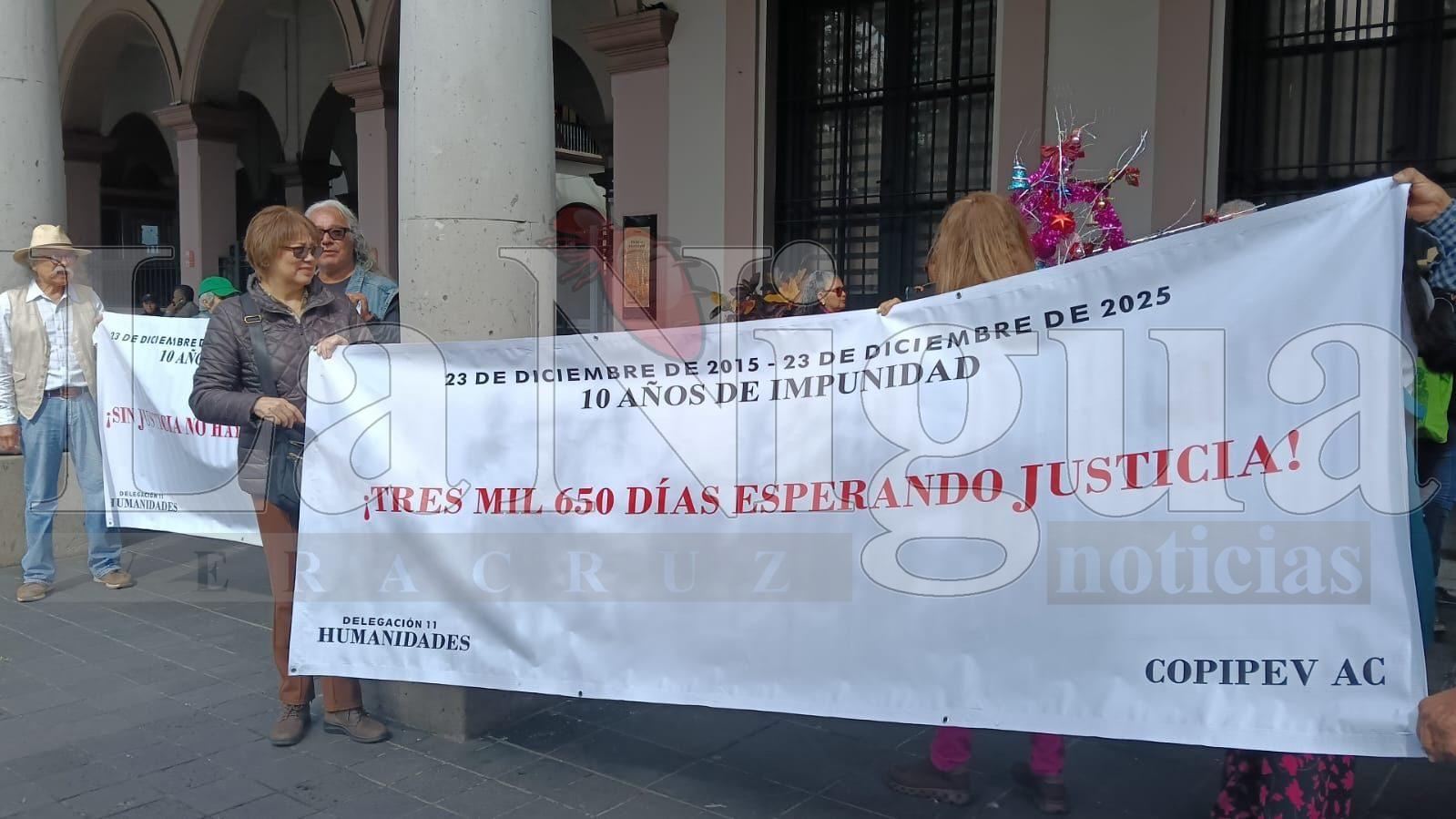 Xalapa, Ver.– La mañana de este martes 23 de diciembre, decenas de integrantes de la Coalición de Pensionistas Independientes del Estado de Veracruz (COPIPEV) se manifestaron en la Plaza Lerdo para conmemorar 10 años de la represión policial ocurrida durante el gobierno del entonces gobernador Javier Duarte de Ochoa.