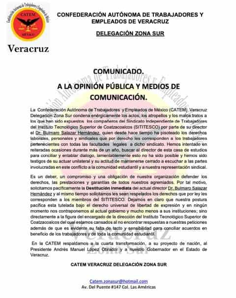 Confederación Autónoma de Trabajadores y Empleados de México (CATEM) Veracruz Delegación Zona Sur, ha exigido que sea destituido el director del Itesco, Bulmaro Salazar Hernández.