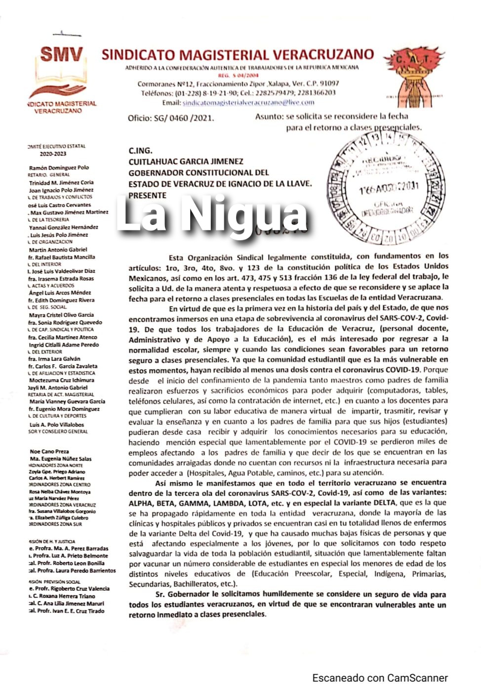 Xalapa, Ver.- El Sindicato Magisterial Veracruzano ( SMV ) solicitó al gobernador Cuitláhuac García Jiménez aplazar el retorno a clases presenciales en todas las escuelas de la entidad veracruzana, al estar inmersos todos en una etapa de sobrevivencia al SARS CoV-2, a través de un oficio número SG/0460/2021 con fecha de este lunes 16 de agosto, dirigido al Ejecutivo del Estado, con copia al secretario de Educación de Veracruz, Zenyazen Roberto Escobar García y demás funcionarios de la dependencia educativa, se destaca que todos los trabajadores de la educación son los más interesados en regresar a la normalidad escolar, siempre y cuando las condiciones sean favorables para un retorno seguro a clases en el documento, signado por los integrantes de la dirigencia sindical que encabeza Ramón Domínguez Polo, se expone también que la comunidad estudiantil es la más vulnerable en estos momentos y al menos hayan recibido una dosis contra el coronavirus.